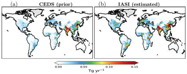 Global maps of the NH3 emissions over 2019–2022 are derived using IASI NH3 spaceborne observations, the LMDZ-INCA chemistry transport model at 1.27°×2.5° resolution, and the mass-balance approach. The average global NH3 emissions over the period are ~97 Tg NH3 yr-1, which is significantly higher than three reference inventories. The analysis provides confidence in the seasonal variability and regional budgets and provides new insights into NH3 emissions at global and regional scales.