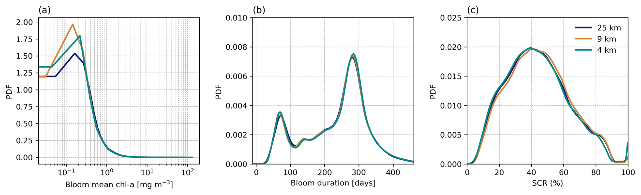 Figure 4Probability density functions (PDFs) of climatological mean (calculated from 1998 to 2022) phytoplankton seasonal cycle metrics, compared across three different spatial resolutions (4, 9, and 25 km) for (a) bloom mean chlorophyll a (chl a), (b) bloom duration, and (c) seasonal cycle reproducibility (SCR). The TS phenology method is used for (a) and (b).