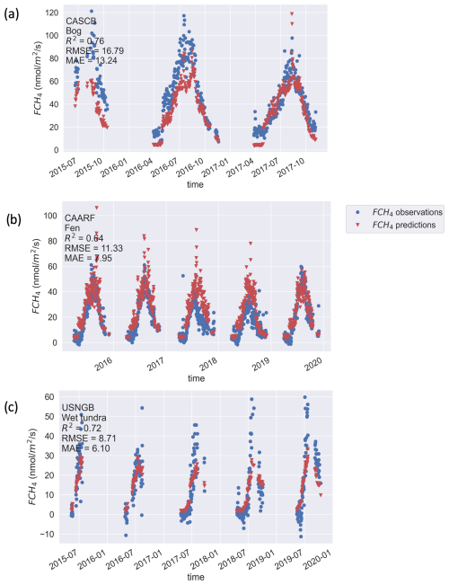 Daily mean CH4 fluxes exhibited great variability in wetlands across space and time (mean = 35 nmol m−2 s−1, σ=65 nmol m−2 s−1; Fig. S3). The model predictive performance (Fig. 4) was calculated for each site, and the average performance with respect to the daily variability in CH4 fluxes was best at wet tundra sites with a mean R2 of 0.56, followed by bog sites (0.51) and fen sites (0.45). Due to the large variability in fen daily fluxes, errors in daily predictions were highest for fen sites (mean RMSE = 54.2 nmol m−2 s−1 and mean MAE = 37.8 nmol m−2 s−1), followed by bog sites (mean RMSE = 27.6 nmol m−2 s−1 and mean MAE = 22.5 nmol m−2 s−1), whereas they were lowest for wet tundra sites (mean RMSE = 13.5 nmol m−2 s−1 and mean MAE = 10.3 nmol m−2 s−1). Our slight model overestimation of daily fluxes (mean ME = 0.9 nmol m−2 s−1) was driven by an underestimation of fen sites (mean ME = −12 nmol m−2 s−1) versus an overestimation of bog (mean ME = 14 nmol m−2 s−1) and wet tundra (mean ME = 3 nmol m−2 s−1) sites.