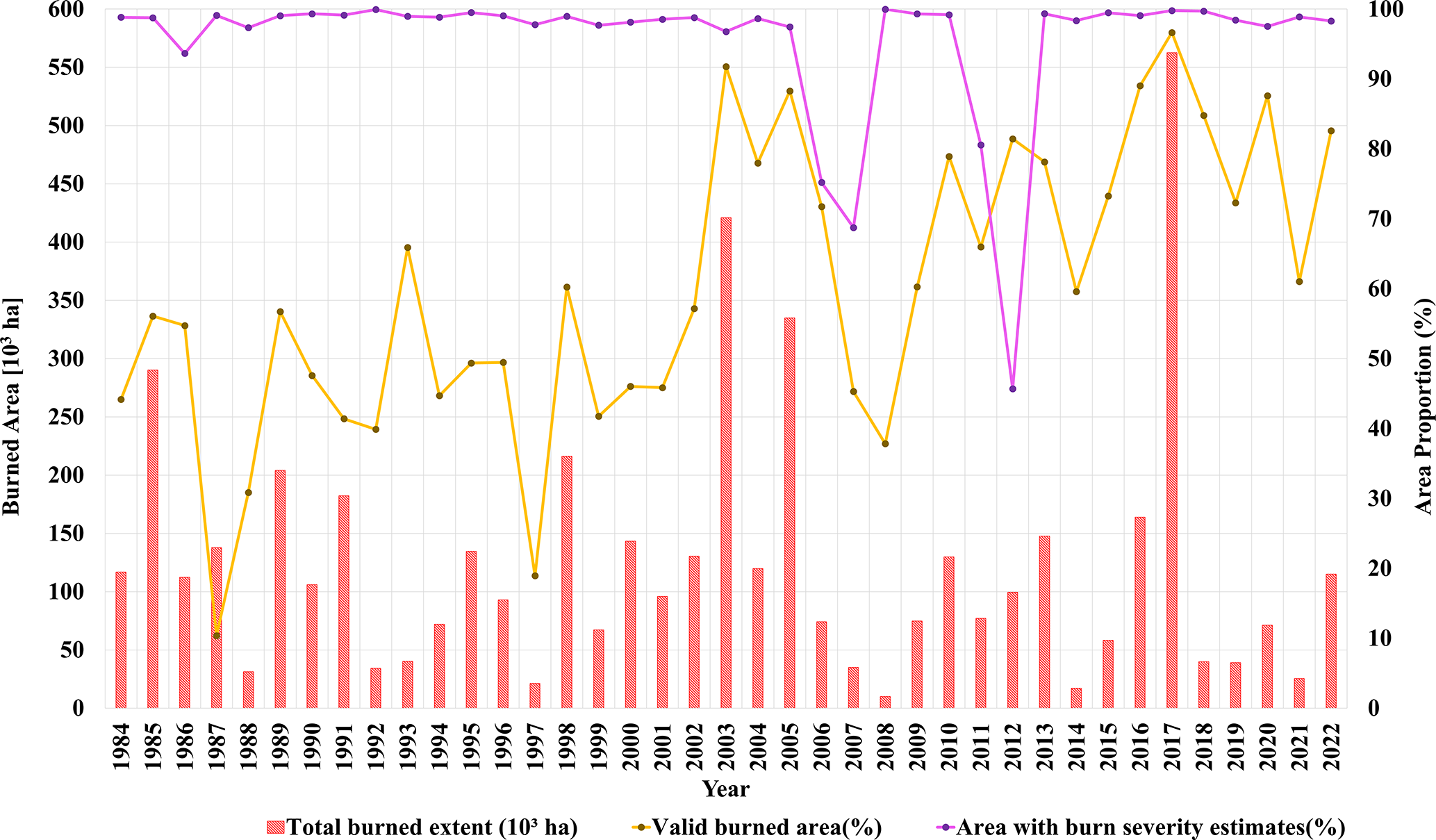 For a temporal overview, in Fig. 3, the annual burned extent is shown with red bars. Although there is no apparent trend, the largest burned extents were registered in 2003, 2005, and 2017, representing the largest fire seasons, with a large difference in comparison to the 1980s and 1990s. The highest percentage of valid burned area occurred in 2017, for which 99.8 % had burn severity estimates. For most of the years, this atlas provides burn severity estimates for more than 90 % of the area, with the exception of 2012, 2007, 2006, and 2011, with values varying between 45.7 % and 80.6 %. The variation of area with burn severity estimates (pink line) highlights the lack of burn severity estimates for annual valid fires. For recent years – 2013 onwards – this variation is almost constant (on average, ≈ 98.8 %).