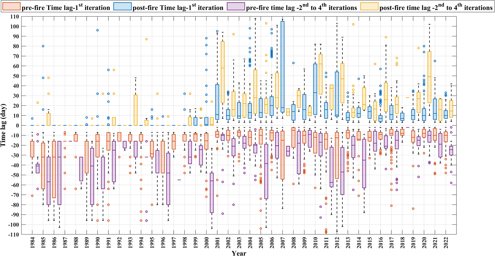 Figure 4Boxplot presenting the dispersion of pixel-by-pixel difference of dNBRs versus the time lag. The time lag, calculated as the difference between time lags of reference NBRs, is shown on the x axis, and the negative values represent pre-fire time lags, while the positive ones represent the post-fire time lags. The median (50th percentile) is presented as the central line (red). The height of the box represents the interquartile range (IQR), which stands for the difference between the first quartile (25th percentile or Q1), shown at the bottom of the box, and third quartile (75th percentile or Q3), shown at the top of the box. The lower whiskers extend to the smallest data points (≥ Q1 − IQR × 1.5), and the upper whiskers extend to the largest data points (≤ Q3 + IQR × 1.5) of the pixel-by-pixel difference between lagged and reference dNBRs per each unique value of time lag.