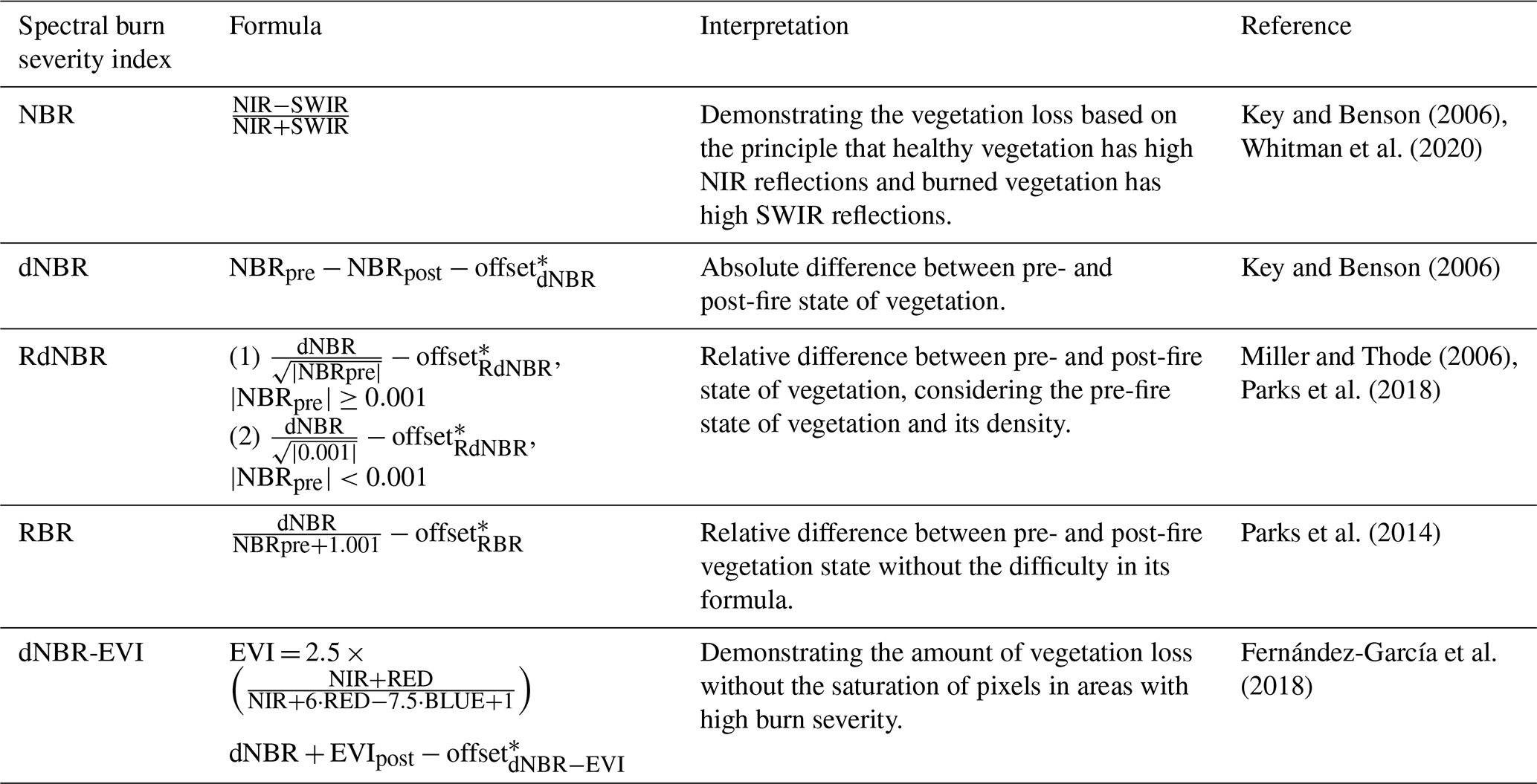 Table 2Summary of burn severity indices and their corresponding formulas. NIR, SWIR, RED, and BLUE refer to the satellite bands of the NIR, SWIR, red, and blue bands, respectively.