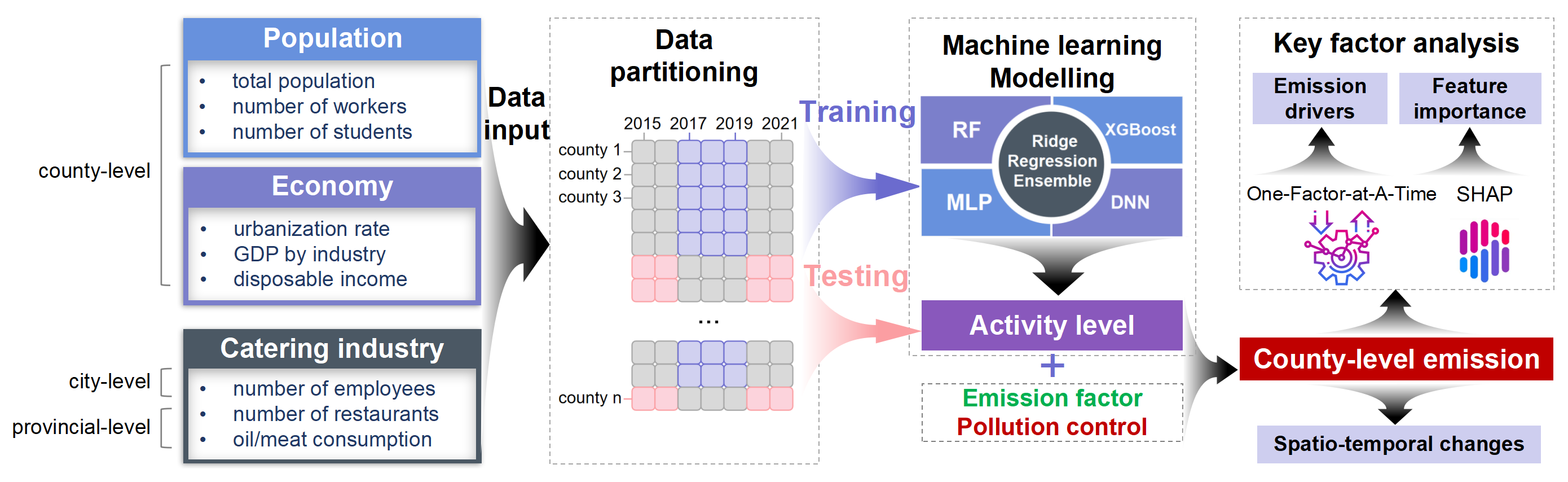 In recent years, machine learning has been widely applied in atmospheric pollution research due to its powerful capability to process large-scale spatiotemporal datasets and capture complex nonlinear relationships within them (Liu et al., 2023; Prodhan et al., 2022a; Zhang and Zhao, 2024; Zheng et al., 2021). Models such as random forest (RF), eXtreme gradient boosting (XGBoost), and deep neural networks (DNNs) have demonstrated strong performance in predicting pollutant concentration time series and identifying spatial distributions (Chen et al., 2024; Prodhan et al., 2022b; Ren et al., 2022; Wu et al., 2024; Xu et al., 2023). Ensemble machine learning models further achieve better and more stable results by combining predictions from individual base models (Liu et al., 2023; Ren et al., 2022). They can help supplement sparse datasets, serving as an effective alternative for obtaining key data that would otherwise be computationally expensive or inaccessible to collect (Ren et al., 2022; Shi et al., 2024; Xiao et al., 2018). When integrating machine learning with the SHapley Additive exPlanations (SHAP) additivity algorithm, the key factors for the predictive target and their influence patterns can be identified (Hou et al., 2022; Yang et al., 2023a). Most importantly, these approaches hold significant potential to address key challenges in cooking emission inventory development. Where conventional activity data at large spatiotemporal scales are unavailable, ensemble machine learning models can predict long-term, high-resolution activity levels by capturing complex relationships between cooking activities and fundamental socioeconomic indicators. Coupled with SHAP analysis, they can provide insights into how socioeconomic factors influence emission trends. However, such efforts have not yet been made.