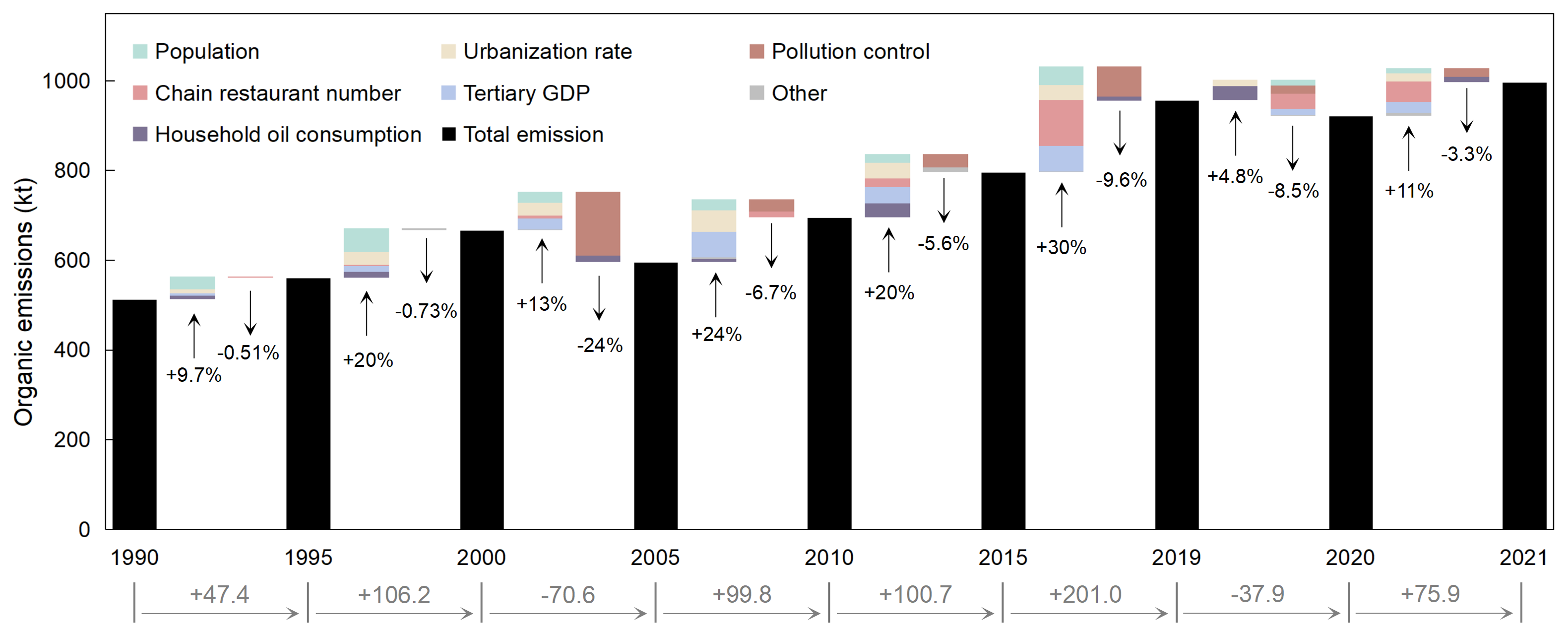 Since 2015, the increase in the number of chain restaurants has been the main driver for cooking emissions, possibly attributed to the prosperity of the catering industry brought about by online food delivery services (Maimaiti et al., 2018; Zhao et al., 2021). From 2015 to 2017, the number of users of online food delivery surged from 114 million to 343 million, and this figure continues to climb (Maimaiti et al., 2018). The tertiary GDP, urbanization rate, and population also contribute to the growth of cooking emissions. Meanwhile, stricter pollution control measures led to a more pronounced reduction in emissions (achieving an 8.4 % decrease from 2015 to 2019). However, this effect remained relatively limited compared to the rapid growth in total emissions (+30.0 % during the same period). This suggests that existing regulations were insufficient to address the growing emissions from the catering industry, highlighting the need for updated and more stringent policies specifically aimed at controlling cooking emissions. Overall, the primary driving factors of cooking organic emissions in the early (1990–2001), middle (2001–2015), and recent (2015–2021) periods are population growth, the rise in tertiary GDP and urbanization rates, and the increase in the number of chain restaurants.