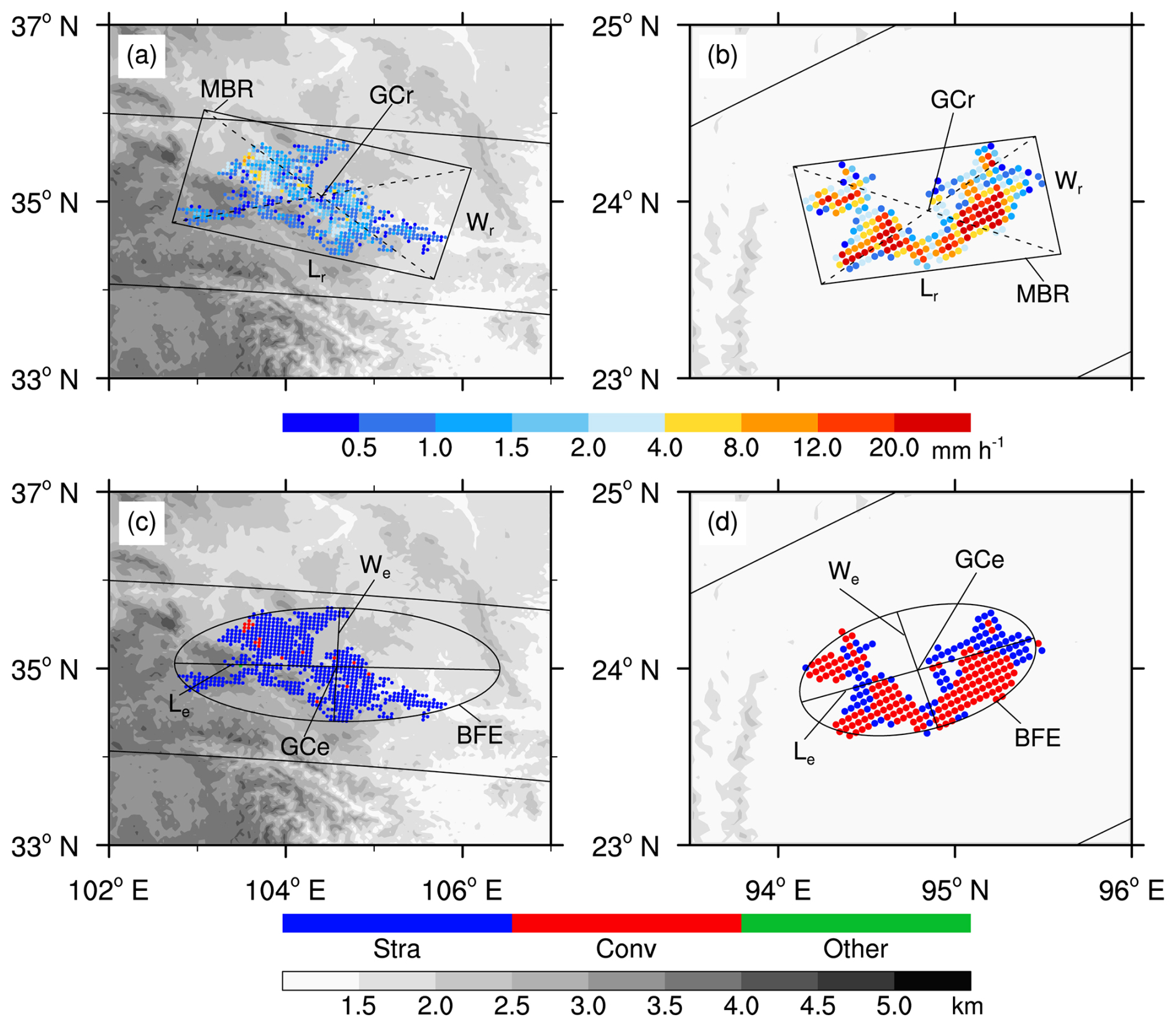 Figure 1Two rain cells occurred on 2 June 1999 and 13 June 2003 measured by PR: rain rate (a, b) and rain type (c, d, blue, red and green represent for stratiform, convective and other precipitation, respectively). The two rain cells in up panel were identified by MBR method, in bottom by BFE method. GCr and GCe represent for geometric center of rain cell identified by MBR method and BFE method, respectively. The gray level in the figure represents the elevation of the terrain.