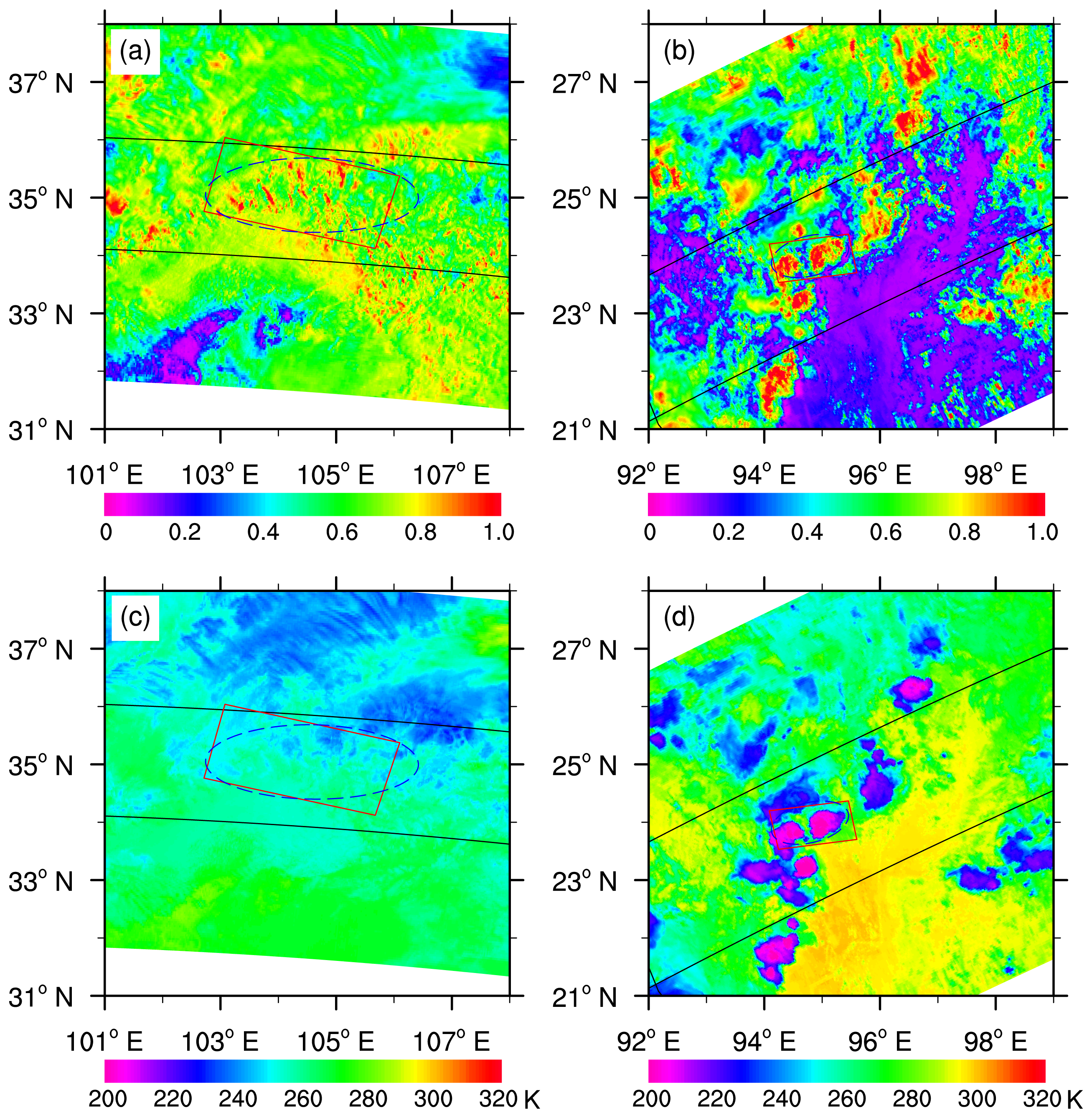 Figure 2The reflectance distribution of visible channel at 0.63 µm (a, b) and brightness temperature distribution of far-infrared channel at 10.8 µm (c, d) for the two cases observed by VIRS (Visible and Infrared Scanner). The solid black line is PR (Precipitation Radar) scanning track. The red solid rectangle and blue dash ellipse represent for the area of rain cell identified by MBR method and BFE method, respectively.