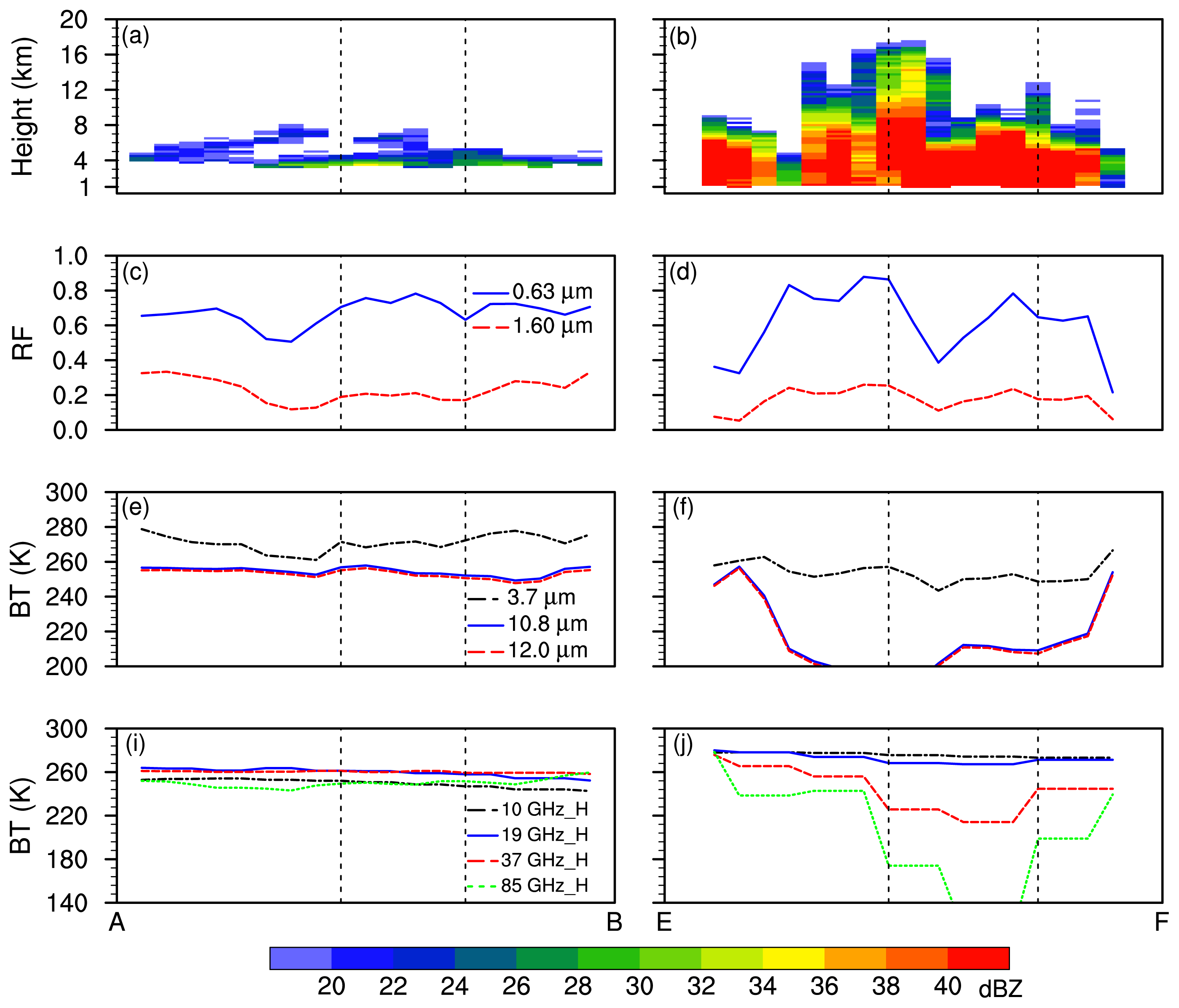 Figure 5The vertical cross sections of reflectivity factor (a, b), reflectance at VIRS channel 0.63 and 1.60 µm (c, d), infrared brightness temperature at VIRS channel 3.7, 10.8 and 12.0 µm (e, f), microwave brightness temperature at TMI horizontal channel 10, 19, 37 and 85 GHz along AB line and EF line as shown in Fig. 4a and b.