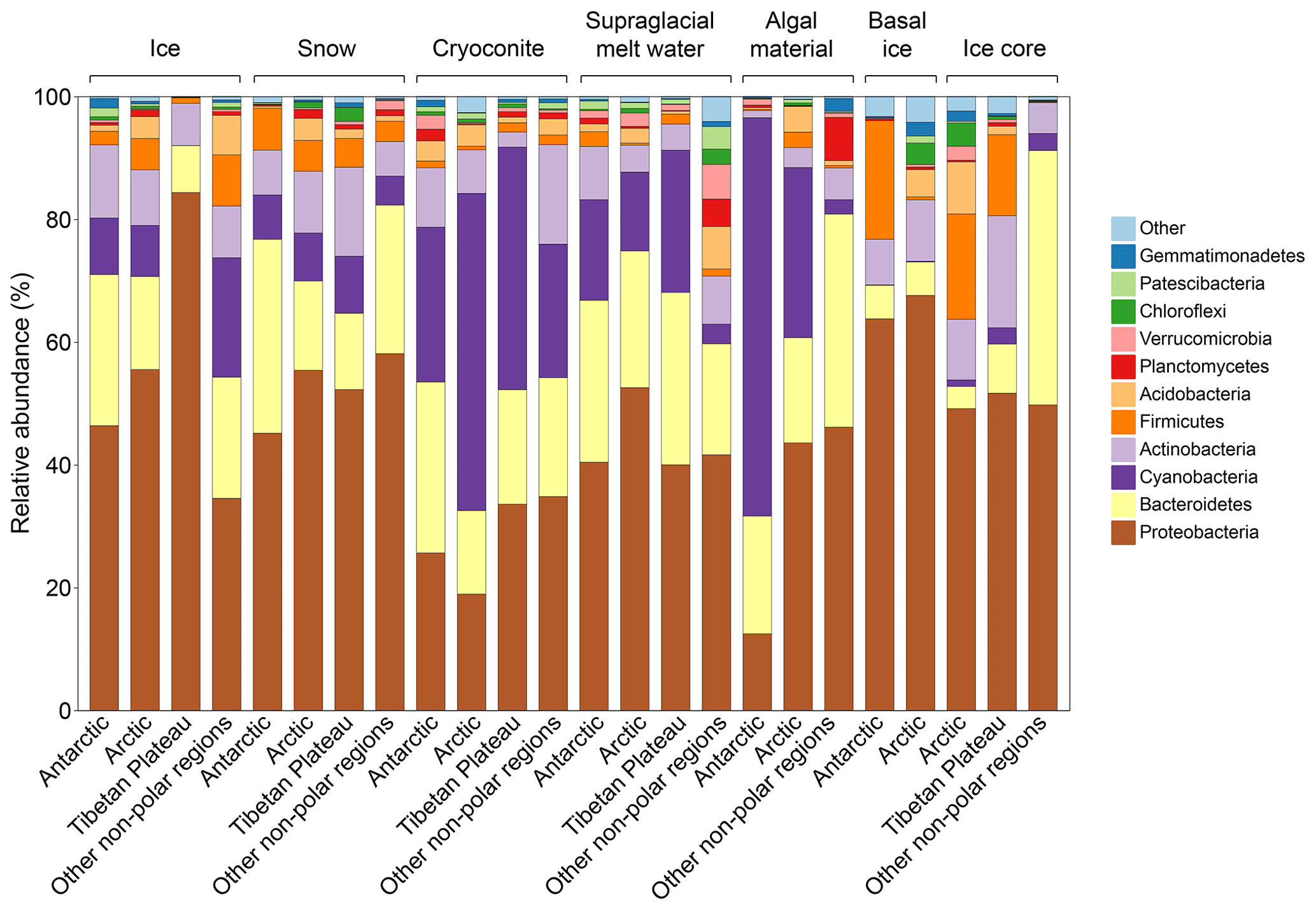 Figure 2Taxonomy composition of supraglacial ecosystems in glaciers of the Antarctic, Arctic, Tibetan Plateau, and other alpine regions. Taxonomy is inferred based on amplicon sequencing results.