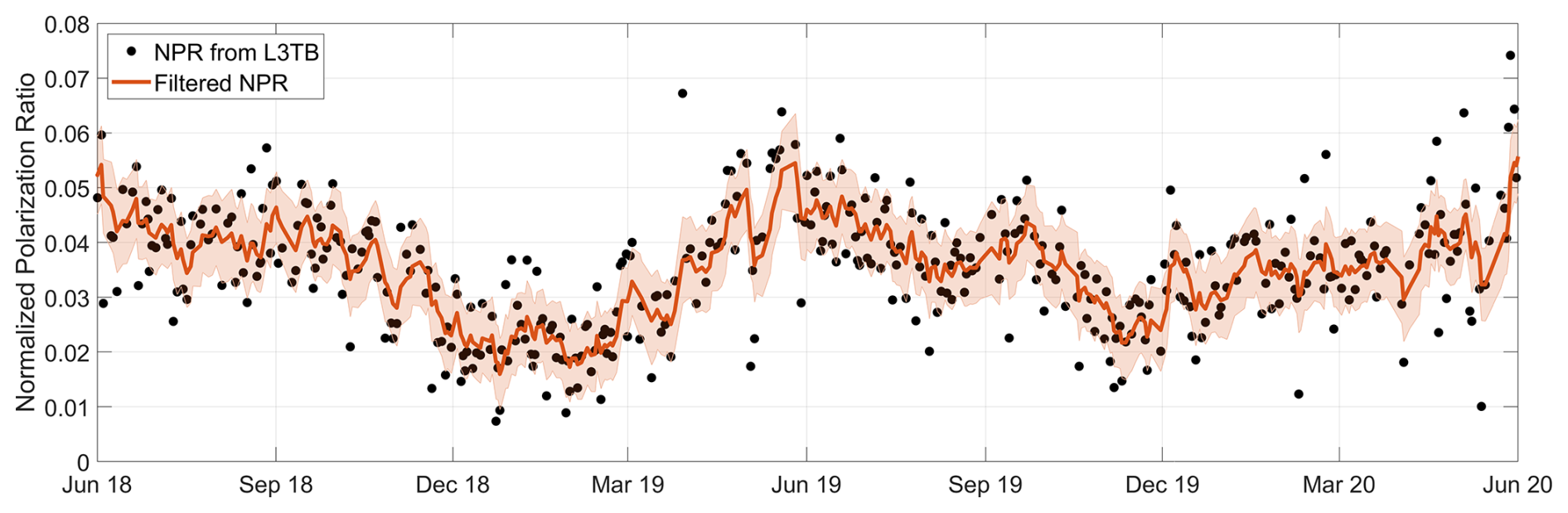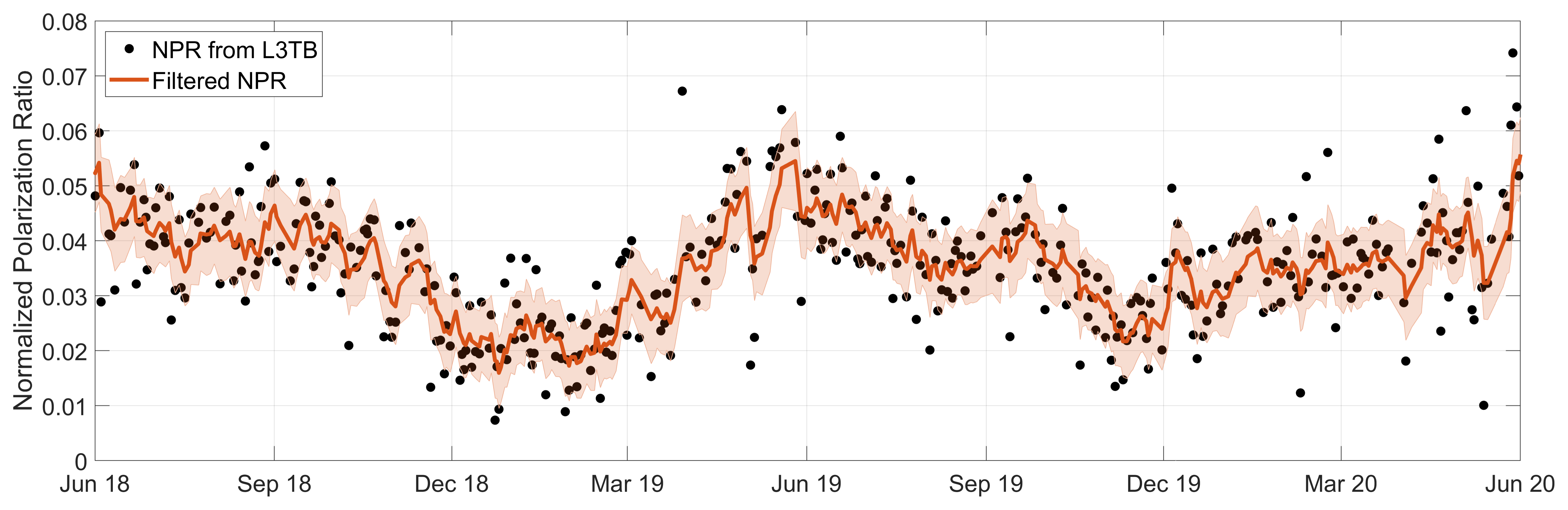 The individual SMOS L3 brightness temperatures, although averaged over the incident angle bin, contain noise that hinders the FT detection. To remove noise from the NPR time series computed from the L3TB, a temporal filtering is performed. In the SMOS L3FT processor, a simple Kalman filtering approach is used (Kalman, 1960; Särkkä, 2013). Every grid cell is filtered independently from every other, and the time series from a given grid cell is modelled as a dynamic linear model; hence,