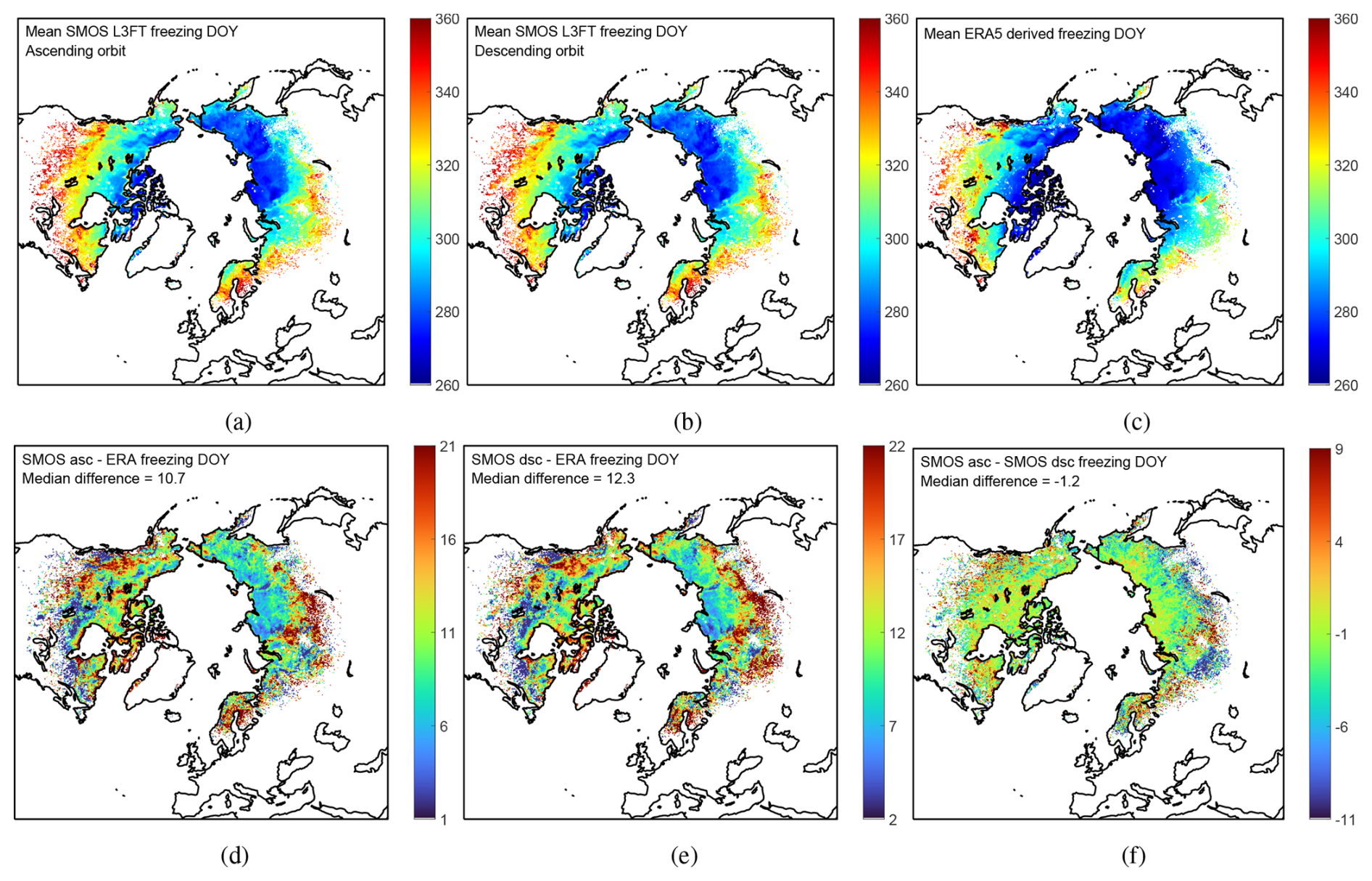 Figure 7 shows scatter plots comparing the mean days of first freezing between the datasets. The associated statistics are shown in Table 6. In general, SMOS seems to estimate later freezing than the ERA5 soil temperature would indicate (13–14 d on global average). Possible reasons for this difference include the following: (1) the SMOS observation frequency – it is possible that SMOS observes the freezing later simply due to delayed good quality observation with respect to the soil freezing. RFI is a usual disruption to the SMOS observations. (2) The estimation of the day of first freezing from the two datasets is slightly different, as the SMOS observation times have to be accounted for. (3) Systematic errors in the ERA5 soil temperature data – in particular, the first freezing is derived by looking at the time when the soil temperature drops below 0 °C. This estimate might be sensitive to errors in the modelled temperature values.
