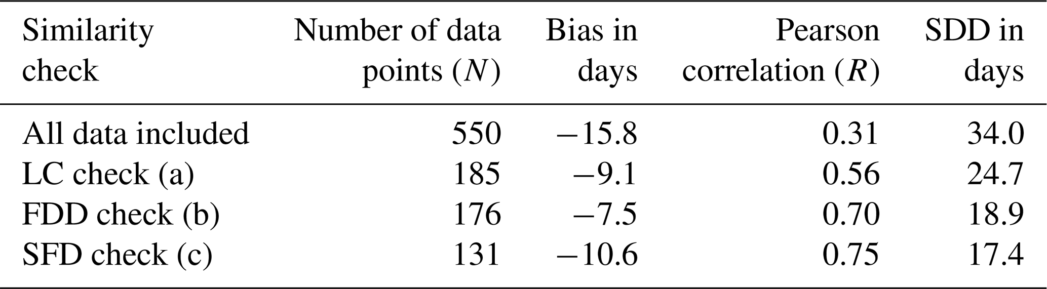Table 4The comparison result metrics for ascending orbit SMOS DoFF and in situ SFTI DoFF using the 50 % threshold. The representativeness checks (land class (LC), FDD, and SFD) were applied cumulatively: for example, “SFD check (c)” includes only those data points that passed both the LC (a) and FDD (b) checks.