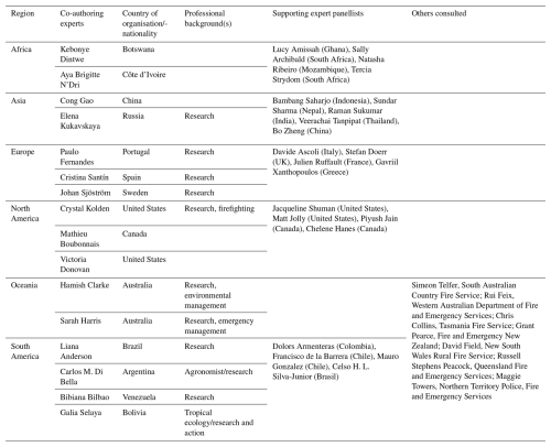 While an extreme fire event or extreme fire season may be visible as a significant anomaly against historical Earth observations, the scientific community seeks to apply a more comprehensive definition of extreme fire, including its impacts on society and the environment. To catalogue extreme events that were not necessarily visible in Earth observations, regional expert panels were constructed and given responsibility for identifying extreme events of the past fire season (Sect. 2.1.3). The expert panels were given flexibility to identify and catalogue extremes that are not captured by Earth observations, such as suppression difficulty or impacts on society or the environment (see Sect. 2.1.3). Hence, Sect. 2.2 identifies a variety of impactful events displaying a broad range of characteristics and impacts that can occur across diverse fire regimes (e.g. Archibald et al., 2009; Cunningham et al., 2024a, b; Keeley, 2009).