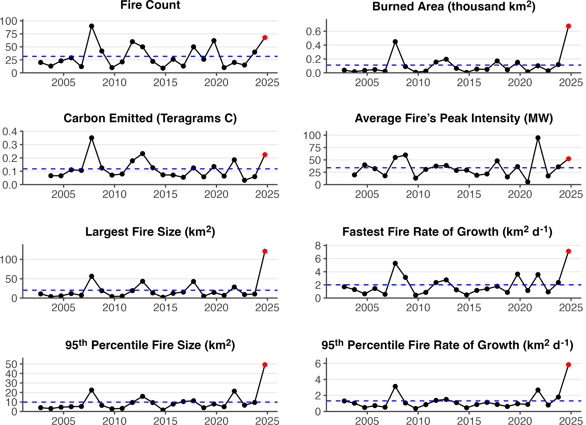Due to the diversity of environmental settings in which fires occur and the range of ecological, economic, or societal impacts caused, defining an extreme fire or an extreme fire season remains inherently challenging. To date, extreme fires have commonly been defined by their BA extent, by their feedback on the global climate, and by their socioeconomic and ecological impacts (Linley et al., 2022, 2025; Driscoll et al., 2024). We reviewed the range of approaches that can be taken to identify extreme wildfire events in our inaugural report (see Appendix B1.1 of Jones et al., 2024b). A universally accepted objective definition of “extreme” remains elusive, reflecting a series of data- and knowledge-oriented challenges. Data-oriented challenges include the absence of consensus on quantitative criteria, with no universally applicable thresholds for size, severity, or other measurable properties; pronounced geographic variability, as regional fire regimes dictate the relevance of particular thresholds; evolving definitions that have progressively expanded to encompass a broader range of fire types and behaviours under changing climatic conditions; and context dependence, whereby interpretation is contingent on ecosystem characteristics, historical fire regimes, and benchmarks such as return intervals or ecosystem damage. Knowledge-oriented challenges centre on the lack of agreement over qualitative criteria, including fire behaviour and impacts; the proliferation of overlapping and sometimes redundant terminology (e.g. “megafire,” “catastrophic fire”); the influence of linguistic and cultural context on interpretation and reporting; the shaping of scientific terminology by societal discourse, necessitating accessibility to diverse audiences; and the limited rigour, clarity, and standardisation evident in existing definitions. Recognising these complexities and the need for transdisciplinary processes to establish robust, standardised criteria in future work, this report maintains a deliberately broad and flexible definition of extreme.