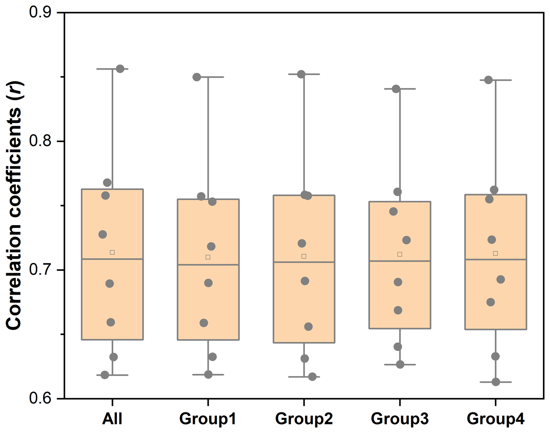 Figure 7The correlation coefficient comparison for Random Forest regression models with different input features. Dots represent correlation coefficients (r) obtained from models trained with different feature combinations. (All: all features; Group1: except anthropogenic features; Group2: except topography features; Group3: except climate & soil features; Group4: except vegetation features.)