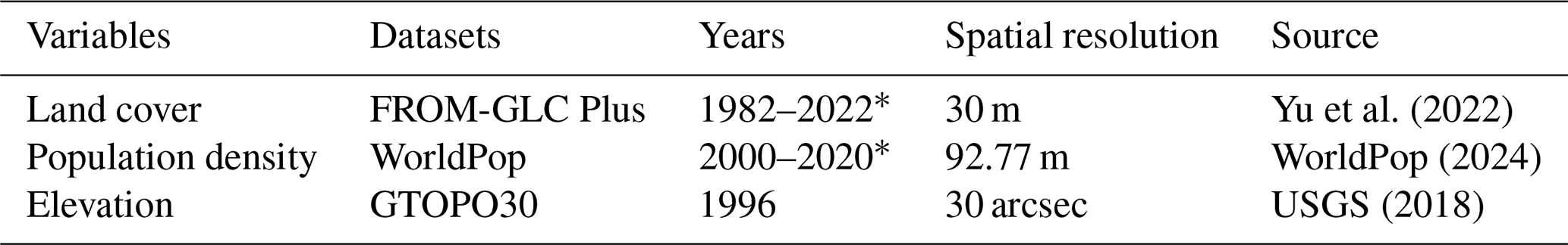 As for the multiple spatial resolutions of datasets shown in Tables 2 and 3, all the datasets were reprojected and resized to 5 km. Specifically, the resolution of land cover maps were reduced by calculating the percentage of grassland and cropland, impervious surface, and cropland within the 5 km grids. In constructing the suitability masks, we combined grassland + cropland for grazing species and impervious surface + cropland for captive species (Cheng et al., 2023a). To generate theoretical suitable masks, the land cover percentage maps were further masked with population density less than 250 000 people per km2 and elevation less than 5600 m. Since the statistics cover up to 1961, for population dataset before 2000, we used the map of 2000 instead. Meanwhile, the land cover masks before 1982 were estimated from 1982. Afterwards, the pixel-level livestock intensities were obtained based on the annual population and land cover products, as well as country-level livestock numbers provided by FAOSTAT.