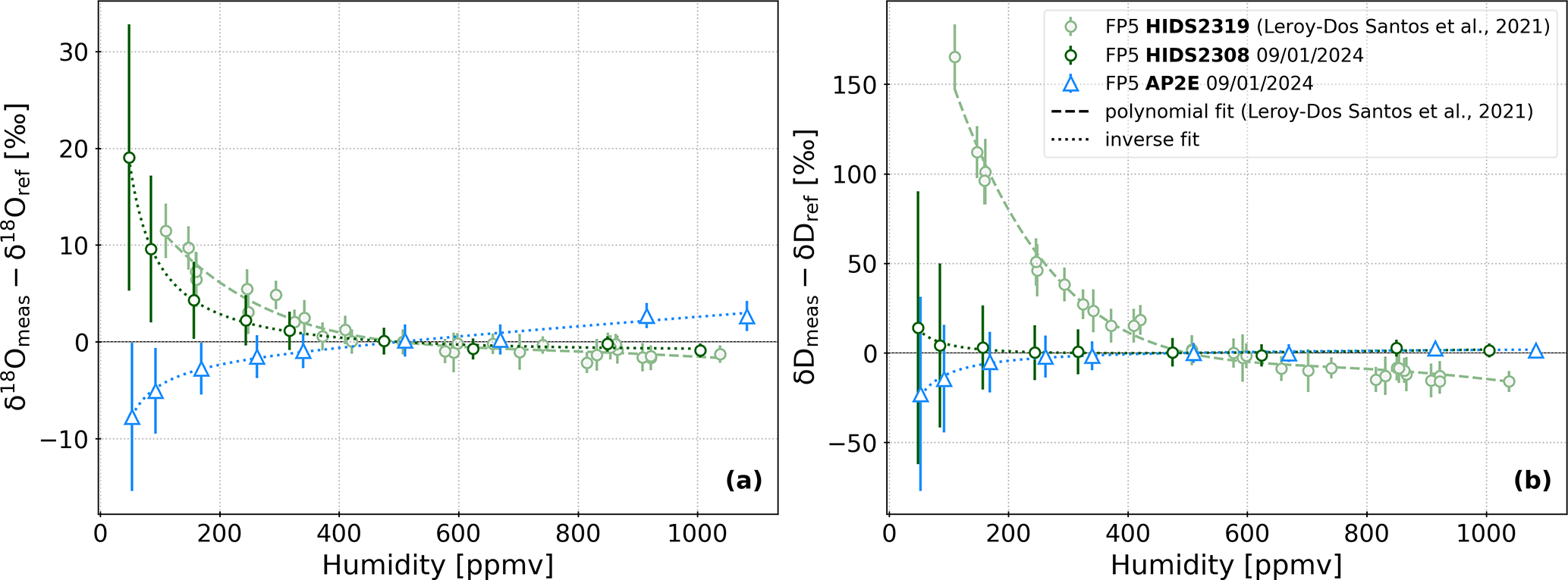 Figure 3 shows the humidity-isotope calibration curves determined with the laboratory standard FP5 (δ18O =−50.52 ‰ and δD =−394.7 ‰, Sect. 2.2.2), for three laser spectrometers (described in Sect. 2.1): (1) the Picarro HIDS2319 analyser from Leroy-Dos Santos et al. (2021), (2) the Picarro HIDS2308 analyser (this study) and (3) the AP2E analyser (this study). For the Picarro HIDS2319 analyser, the calibration steps were performed with the initial version of the LHLG while for this study (Picarro HIDS2308 and AP2E analysers), the calibration steps were performed with the newest version of the LHLG (Sect. 2.2.2). Each point on the humidity-isotope response curves of all three analysers corresponds to the average isotopic composition of the calibration step over a ten-minute stable period. Note that each calibration step lasted from 40 min to 1 h.