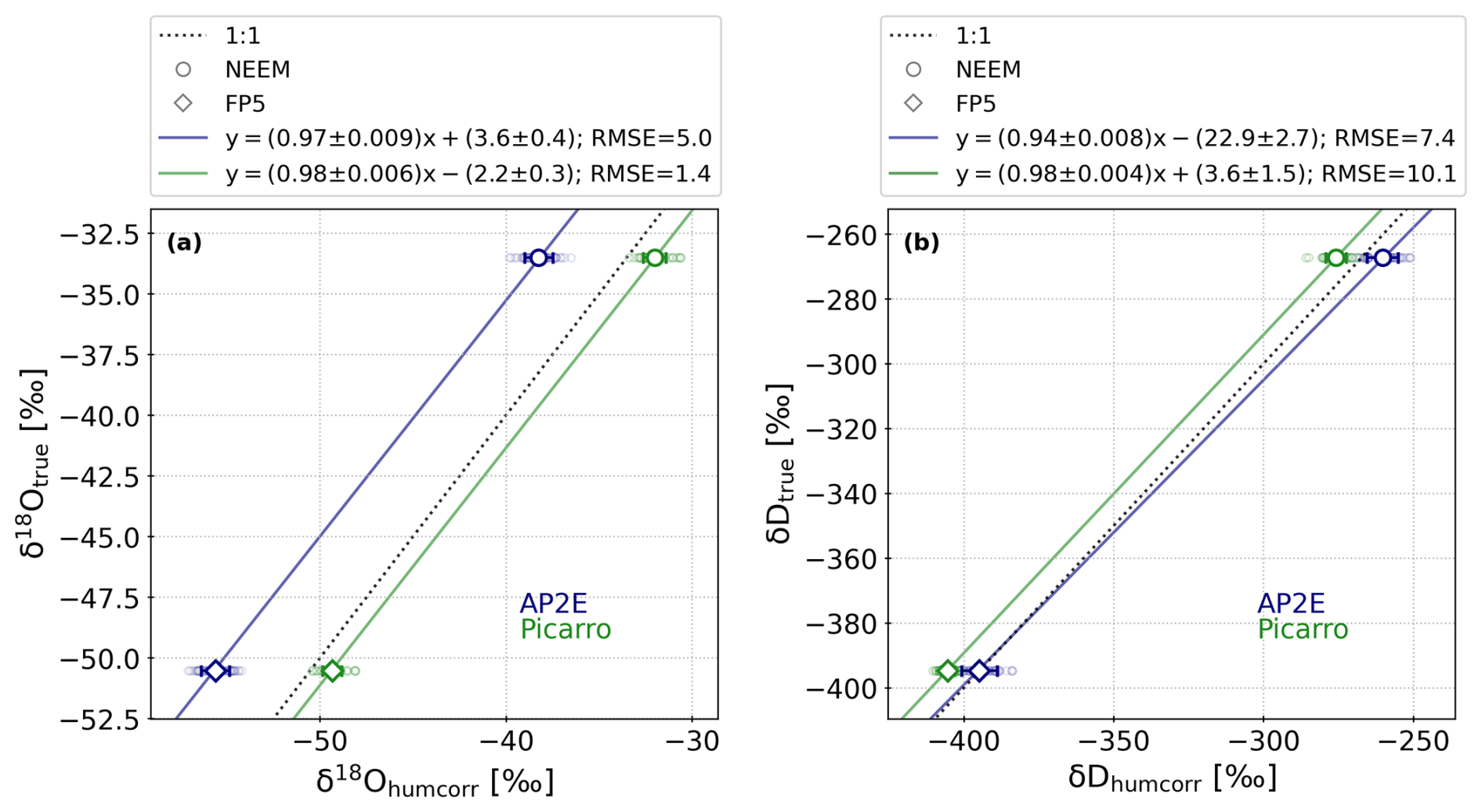 Figure 5Humidity-isotope corrected ratios vs. true isotopic ratios (δ18O in a and δD in b) of two laboratory standards (FP5 and NEEM) for both Picarro and AP2E analysers. In both panels, the smaller coloured markers represent all selected calibrations and the larger coloured markers the average isotopic ratio of all selected calibrations (whiskers represent one standard deviation). The coloured lines show the linear regressions between the true and humidity-corrected isotopic ratios using two laboratory standards.