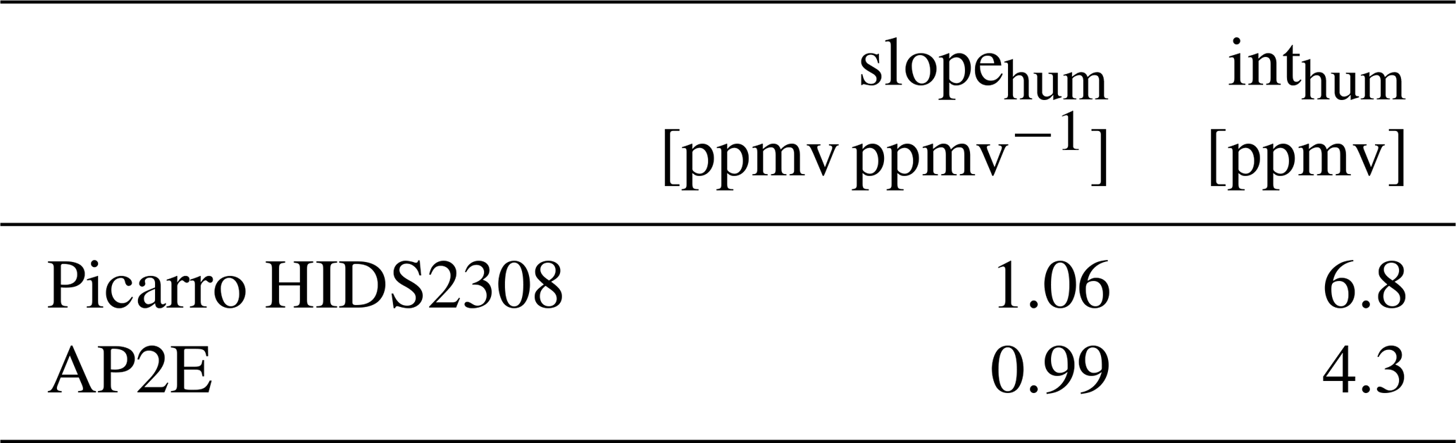 Where hummeas is the raw humidity given by the analyser (either AP2E or Picarro), humcorr is the humidity corrected on the independent measurement and the coefficients slopehum and inthum are determined by a linear regression between the hummeas and the independent humidity measurement. The results of the linear regressions are presented in Sect. 3.1.1.