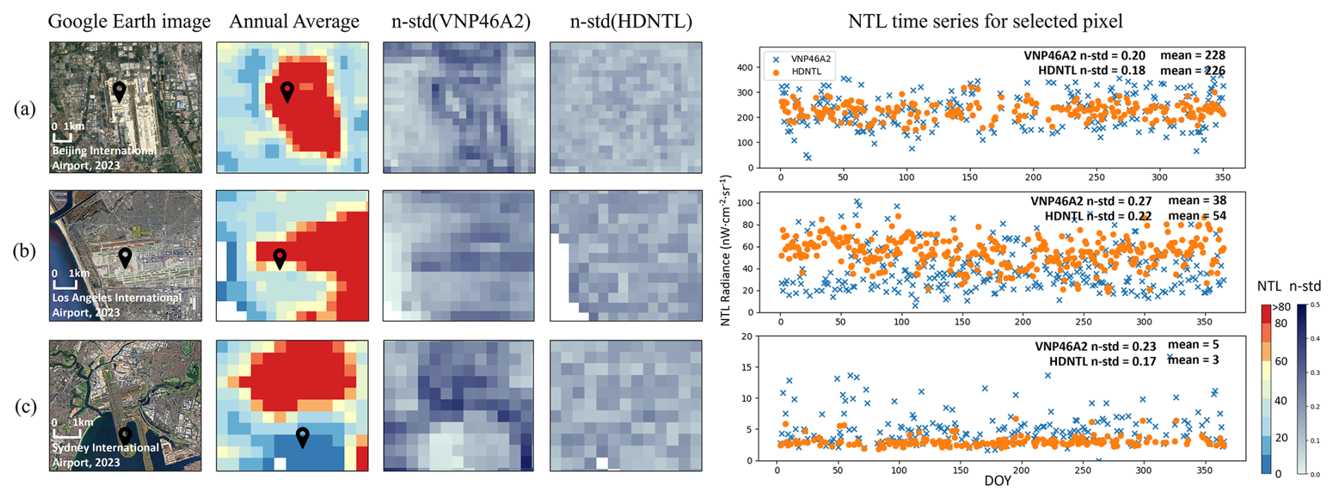 We used two landscapes, airports, and highways, with less angular effects, to demonstrate the effectiveness of spatial mismatch correction. Figure 4 shows three airport cases. The role of spatial mismatch correction is to reduce data fluctuations resulting from capturing the light sources of adjacent pixels due to different daily footprints. We used the normalized standard deviation (n−SD) to see the annual fluctuation for each pixel in the case area. The first case is Beijing International Airport in 2023. A comparison of the n−SD spatial distributions between VNP46A2 and HDNTL indicates that HDNTL consistently demonstrates reduced pixel-level variability in the airport region. We selected one terminal building pixel to see the annual time series, and the n−SD of the NTL time series was reduced from 0.2 to 0.18, while the average did not change much. The second case is at the Los Angeles International Airport in 2023. The n−SD distribution image also showed a large reduction after correction. The fluctuation of the annual time series of the selected pixel (airport runway) decreased, and the n−SD reduced from 0.27 to 0.22. We can also see that the average NTL radiance of the chosen pixel increased from 38 to 54 nW cm−2 sr−1, indicating that the NTL is significantly underestimated due to spatial mismatch, as there are no obvious lights outside the runway. The third case is Sydney Airport in 2023. We also chose a runway pixel. The runway of Sydney Airport is built on the sea, so it should have lower lights. However, the VNP46A2 was overestimated due to the spatial mismatch. After correction, the NTL decreased, and n−SD decreased from 0.23 to 0.17.