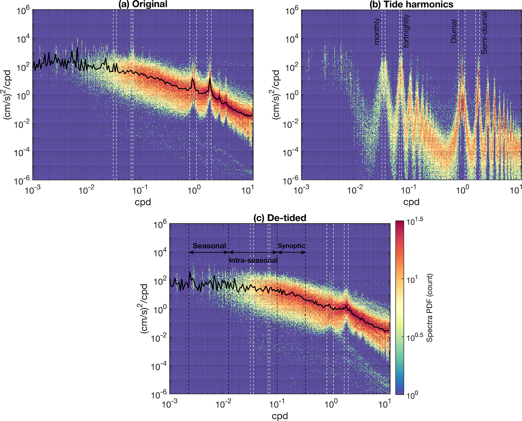 Figure 3The colour shading shows the spectra probabilistic distribution function (PDF) of all the (a) original velocity time series, (b) the tidal harmonics and (c) de-tided velocity time series. Dashed vertical lines denote the upper and lower frequency bounds for monthly (27.6 to 31.8 d), fortnightly (13.7 to 14.8 d), diurnal (0.9 to 1.2 d) and semi-diurnal (0.48 to 0.57 d) tidal components. Higher/lower values (red/blue) mean that the level of energy is more frequently observed at given frequency across different mooring time series. Black dashed lines in panel (c) show the upper and lower frequency bounds for synoptic (3–10 d), intraseasonal (10–80 d) and seasonal-to-annual (80 d–1.2 years) timescales. Black lines in panel (a) and (c) denote the power density level that is the most frequently counted (i.e. the mode) at each frequency range.