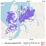 The manual collection of RTS points using the ESRI satellite basemap was effective across a large region but also had several limitations. One challenge was the resolution and zoom limitations, as the minimum detectable landform width was 20 m, potentially excluding smaller features. Seasonal variability of the images in the ESRI satellite basemap further complicated the process, with snowpacks identifiable only in summer images, excluding all autumn (September) imagery. On the other hand, more extensive snow cover on certain images obscured some areas, hindering the accurate inventory of RTS and their attributes in these regions. Additionally, visual artifacts (blur, glare, clouds, contrails) in some imagery led to the omission of some cells, though this accounted for less than 0.5 % of the total dataset.