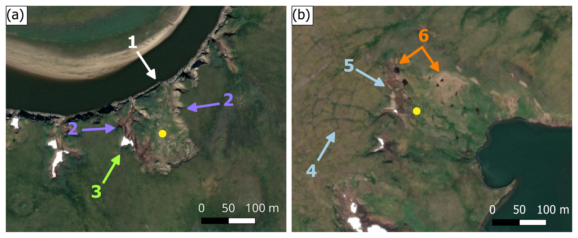 Figure 8Examples of RTS with concurrent processes: (a) stabilized RTS (yellow dot) at a riverbank. The white arrow (1) points to the clear dark boundary between the RTS and the waterbody, which together with the absence of sediment accumulation, indicates ongoing coastal thermo-erosion at the slump base. The purple arrows (2) point to the rugged outline of RTS and traces of erosive channels, indicating lateral thermo-erosion. The green arrow (3) points at the white patch of the remaining snowpack (nivation). (b) Stabilized RTS (yellow dot) at a lakeshore. The light blue arrows (4) point to the polygonal surface around the RTS and (5) the jagged outline of the headwall suggesting ice-wedge degradation. The orange arrows (6) point to the small black patches of thermokarst ponds within the RTS. ESRI basemap used has the following credits: Esri, DigitalGlobe, GeoEye, i-cubed, USDA FSA, USGS, AEX, Getmapping, Aerogrid, IGN, IGP, swisstopo, and the GIS User Community.