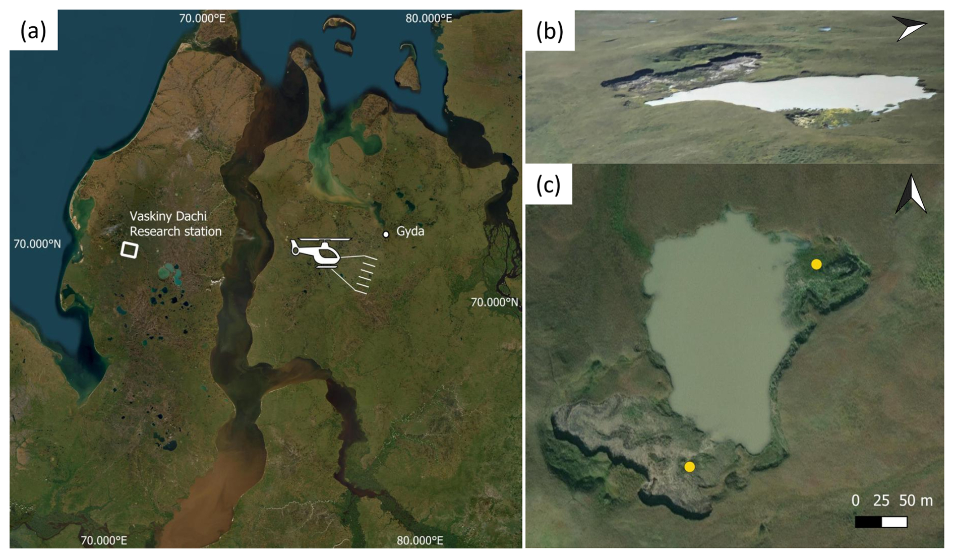 Figure 9Field validation: (a) locations of the Vaskiny Dachi research station with field survey area on Yamal Peninsula and helicopter survey area on central Gydan Peninsula, basemap: ESRI; (b) photo of RTSs from the helicopter taken by Artem Khomutov, July 2023; (c) the same RTSs marked with the yellow point on the ESRI basemap, WorldView-2 24 July 2019. ESRI basemap used in (a) and (c) has the following credits: Esri, DigitalGlobe, GeoEye, i-cubed, USDA FSA, USGS, AEX, Getmapping, Aerogrid, IGN, IGP, swisstopo, and the GIS User Community.