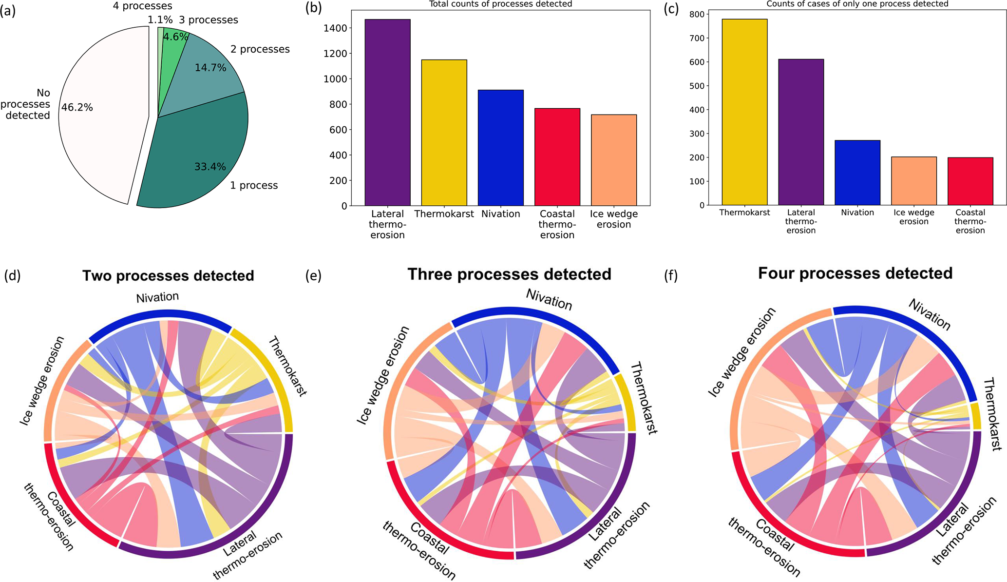 Using chord diagrams (Fig. 14d–f) allowed a depiction of the co-occurrence of concurrent processes estimated for the cases when two, three, or four processes were detected for RTS. In general, the co-occurrence of the concurrent processes shows different results depending on the cases of the amount of the processes detected. There was a clear trend of the co-occurrence of nivation and lateral thermo-erosion among all 3 cases (Fig. 14d–f). The co-occurrence of lateral thermo-erosion and ice-wedge erosion gradually increased with more processes detected. The co-occurrence of the nivation and the coastal thermo-erosion, when only 2 processes are detected, was relatively low but increased significantly with more processes detected. The presence of thermokarst processes, in general, decreased with more processes detected.