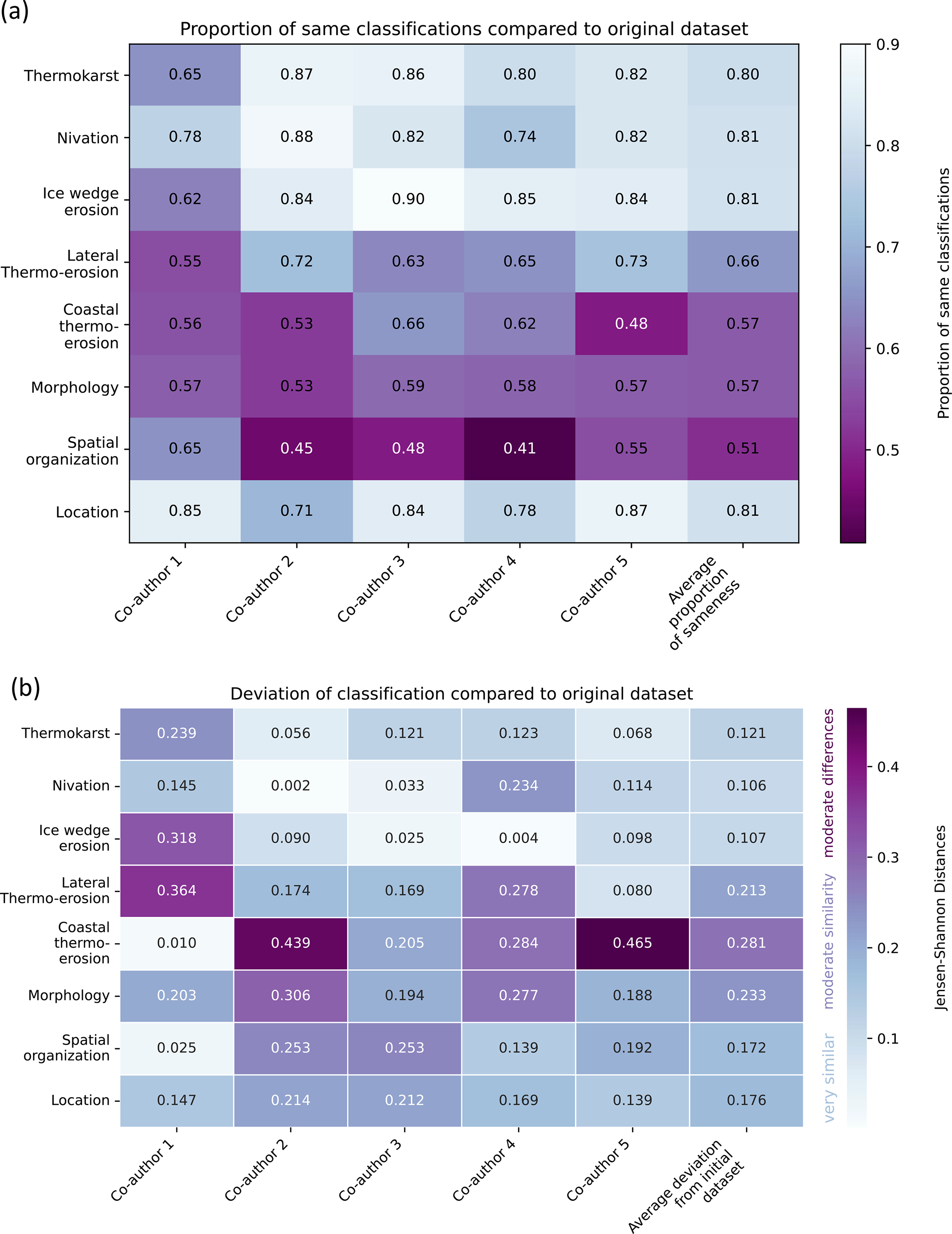 To further quantify classification variability, we calculated Jensen-Shannon distances (Fig. 16b), a metric for measuring similarity between probability distributions. This value ranges from 0.0, indicating identical distributions, to 1.0, representing completely distinct distributions. The results confirmed the overall trend of morphology, coastal thermo-erosion, and lateral thermo-erosion being the most subjective parameters, except for spatial organization, which showed minor differences in probability distributions. Coastal thermo-erosion exhibited the highest variation in classification probability distributions, likely due to two distinct hotspots observed in the heatmap.