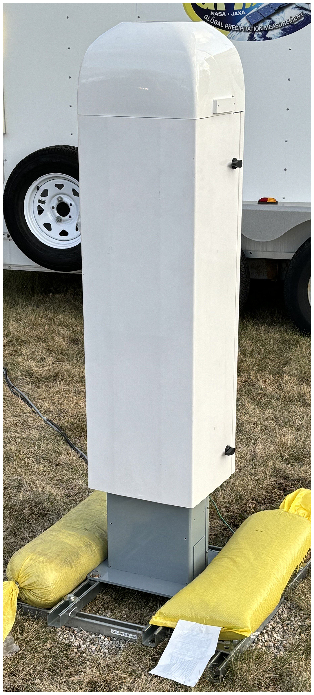 The Pluvio2 Weighing Gauge (Pluvio, Fig. 4) is a weighing precipitation gauge manufactured by OTT Hydromet designed to collect all phases of precipitation. Pluvio records precipitation amount and intensity in both real time (output delay of 20 s), and non-real time (output delay of 5 min). With a sampling interval of 1 min, the accuracy of precipitation amount is ±0.05 mm over a 60 min measuring window and ±0.1 mm min−1 for precipitation intensity. Two types of Pluvio were deployed during the campaign with one being a 200 cm2 collection area and the other being a 400 cm2 collection area. The 200 cm2 model was heated during its deployment. Pluvio's can be subjected to the phenomenon of undercatch due to the orifice limiting accurate totals (Rasmussen et al., 2012; Martinaitis et al., 2015), but a double alter wind shield was deployed around it to reduce this phenomenon. In addition, the redundant measurements with other instruments can be used to validate the observations. The measurements from the Pluvio can be used to calibrate the GPM satellite or ground-based radar retrieval algorithms for precipitation amount and rate.