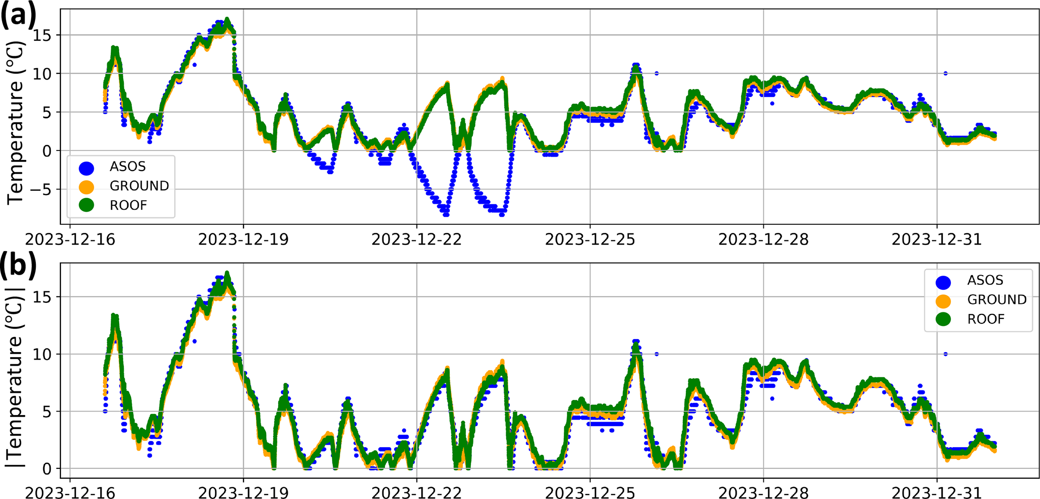One issue to note with the temperature observations was in periods after the computer connected to the AIO was restarted, the temperature would not produce negative temperature observations right away. Figure 14a shows an example of this during 2023–2024, where the KIJD records temperatures well below freezing but the AIO is reporting temperatures of 5–10 °C above freezing. The GHCN data was useful in verifying if the minimum temperature went below freezing or not on a given day. Periods when this occurred were manually identified and corrected by multiplying the AIO observations by a value of −1. Figure 14b shows the absolute values of both temperature time series over the same time window, and the magnitude from both sets of observations match further confirming the issue with the AIO.