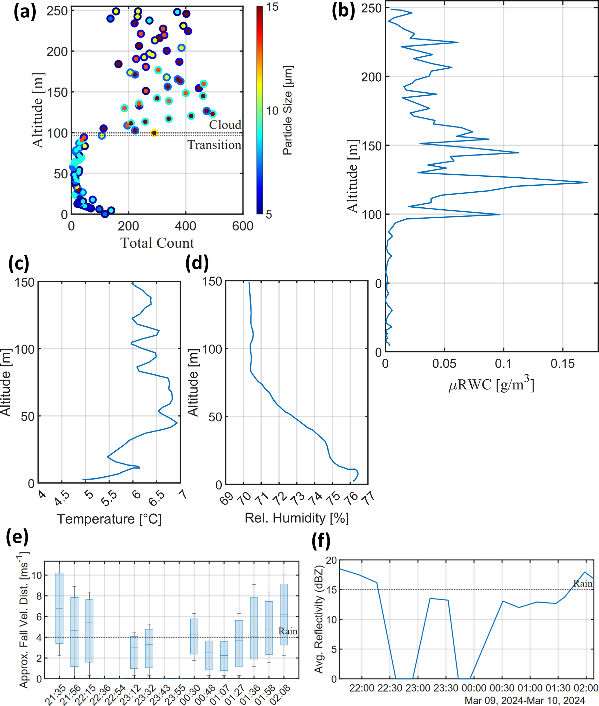 Figure 15Example of data collected from WxUAS during the 9–10 March 2024, IOP deployment. The observations collected included vertical profiles of (a) particle size and count, (b) micro-range water content, (c) temperature, and (d) relative humidity. Additionally, the onboard radar captured information on (e) fall velocity and (f) reflectivity.