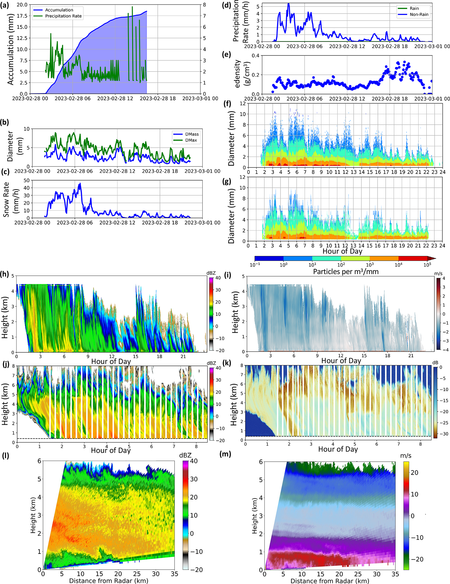 Figure 165 min averages of observations collected at GAIL site on 28 February 2023. AIO observations of (a) temperature and dewpoint, (b) relative humidity, (c) surface pressure, (d) wind speed, and (e) wind direction. PARSIVEL2 observations of (f) maximum and mass-weighted mean diameter, and (g) snow rate. PIP observations of (h) precipitation rate and (i) equivalent bulk density. Reprocessed MRR observations of (j) reflectivity and (k) radial velocity. Particle size distributions for the (l) PARSIVEL2 and (m) PIP. Geometrical classification of snowflakes (n) using a neural network classifier (Thant et al., 2023b), and a machine learning classification (Thant et al., 2023b) of riming degrees of snowflakes (o) based on all MASC and SMAS images during 28 February event.