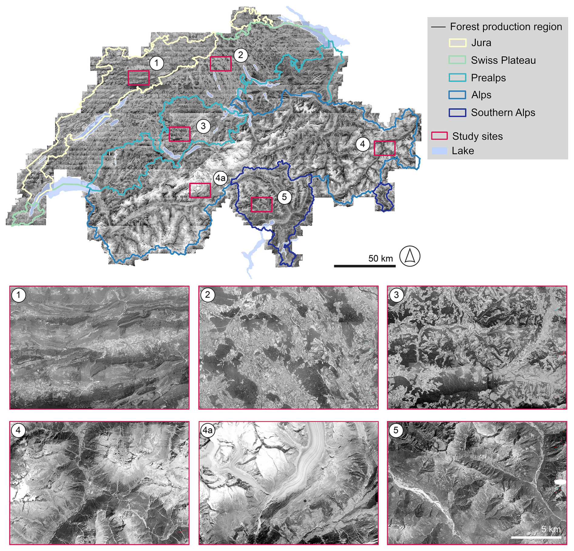 Figure 2The Swiss NFI forest production regions (1 = Jura, 2 = Swiss Plateau, 3 = Pre-Alps, 4 = Alps, 5 = Southern Alps) in Switzerland and the respective location of the study site for each region, along with the generated orthoimage for epoch 1 (1979–1985). An additional study site (4a) was selected for the Alps forest production region.