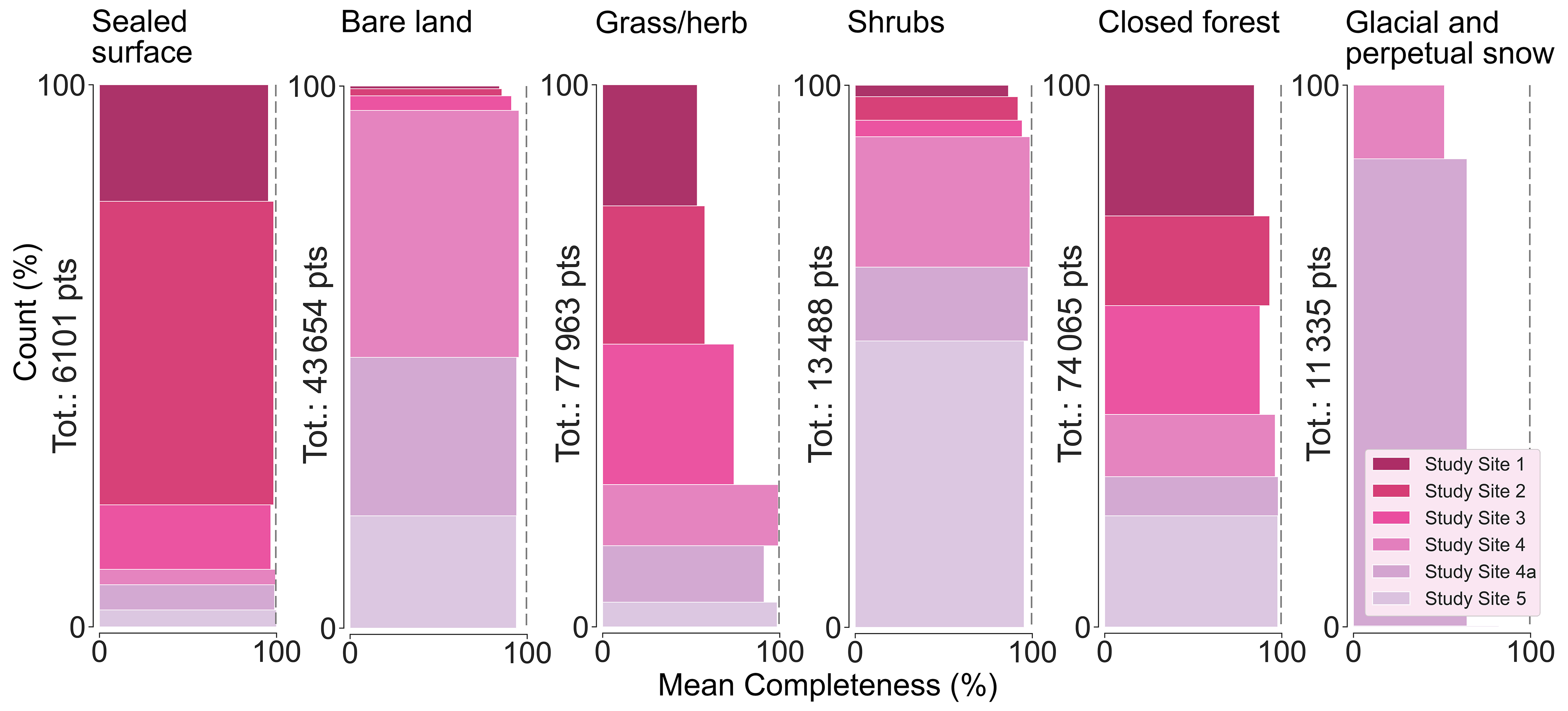 Figure 6Distribution of the mean completeness values (as percentages) for epoch 1 across the six study sites and the six land cover classes – sealed surface, bare land, grass/herb, shrub, closed forest, and glacial and perpetual snow. The snow class is only present in study sites 4, 4a, and 5. Note that for some classes and study sites, the number of points is minimal. For example, there are only 18 points in study site 5, which is equivalent to 0.15 % for the class “glacial and perpetual snow”, and therefore the horizontal bar is not visible.