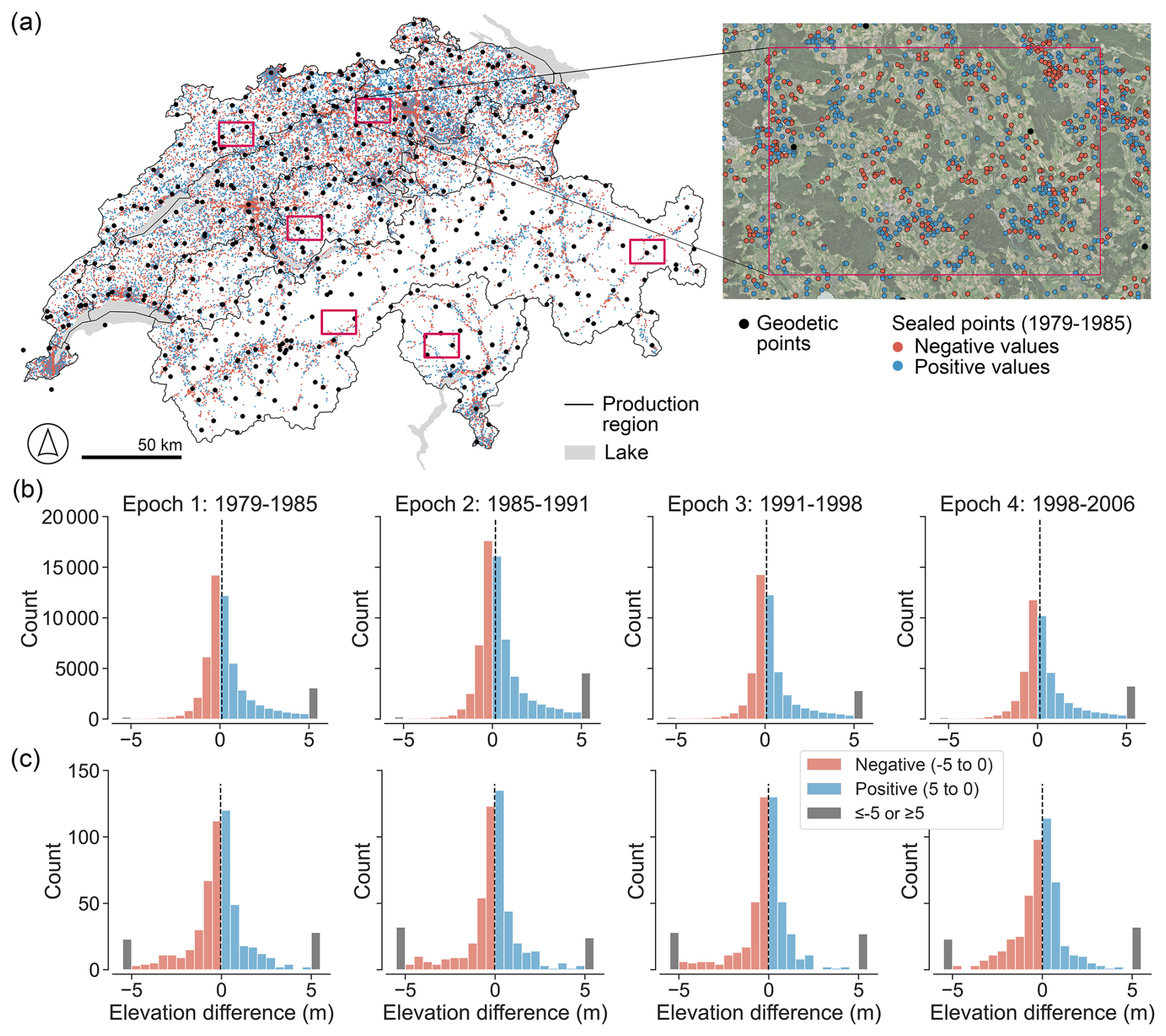 Figure 7(a) Spatial distribution of the sealed surface points and the geodetic points used for the vertical accuracy assessment of the historical digital surface models (DSMs). Sealed surface points are depicted in blue and red, representing the positive and negative differences, respectively, between the DSM for epoch 1 and the reference digital terrain model (DTM, swissALTI3D). The inset shows the distribution of the sealed surface points and the geodetic points for study site 2, overlaid on the orthophoto for the year 2021 (swisstopo, 2023). Frequency distributions of the elevation difference in metres between the DSM and the DTM (b) on sealed surface points and (c) between the DSM and the geodetic points for the whole of Switzerland for the four epochs. The vertical dashed line indicates the median value. The bin size is 0.5 m. The histogram shows the distribution before the filtering used for the root mean square error (RMSE) calculation.