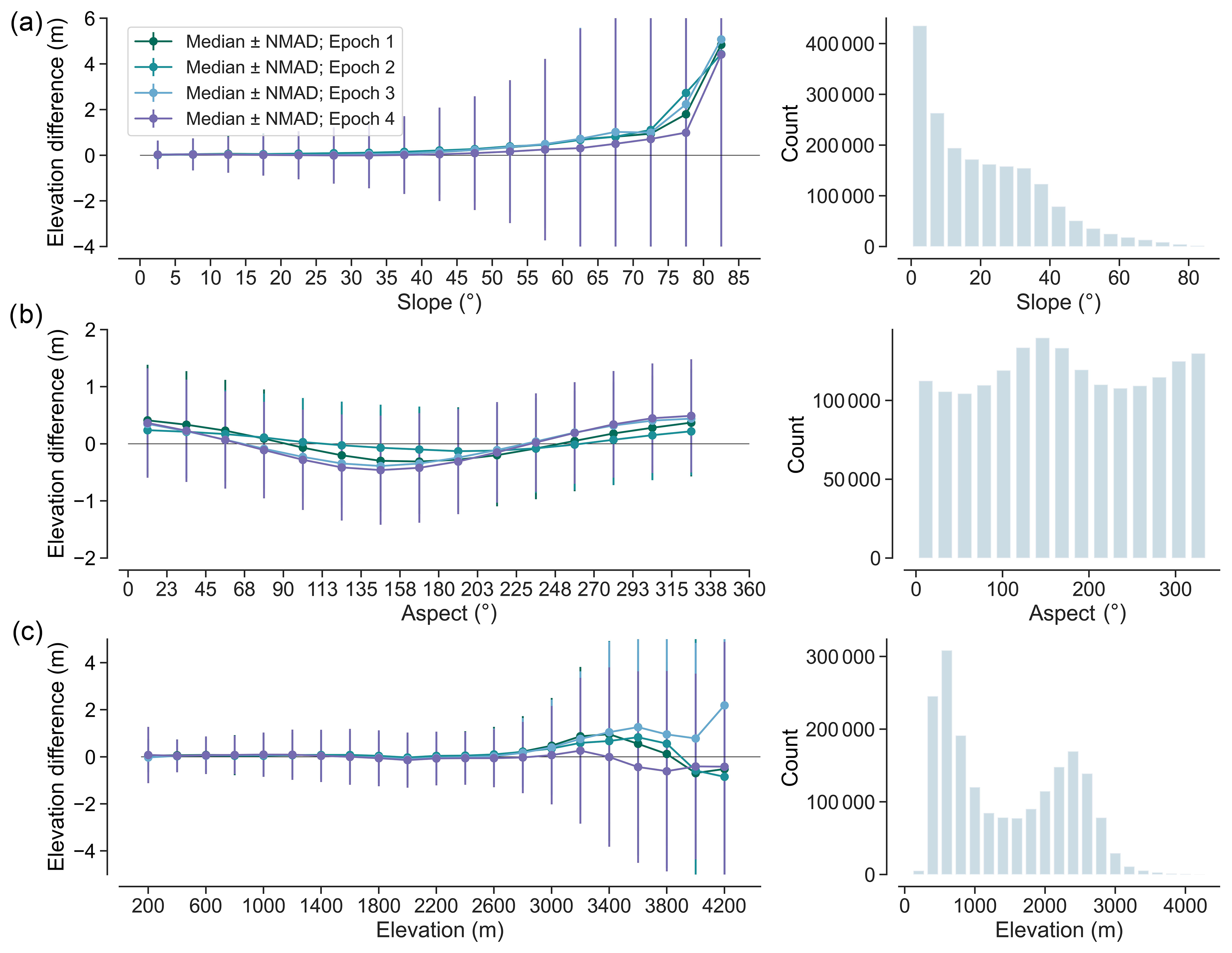 The elevation difference between the historical DSMs and the DTM over grass/herb and bare land points shows no significant bias with slope, aspect, or elevation, as shown in Fig. 8. However, for elevations above 3000 m a.s.l. and slopes greater than 45°, the NMAD increases drastically, exceeding 2 m for all four countrywide DSMs. However, points within these intervals represent only approximately 5 % (slope) and 1 % (elevation), as shown in the histograms in Fig. 8. The elevation bias dependence on aspect shows a potential shift, with median values below 0.5 m and a constant NMAD of ±0.8 m for all datasets and aspect intervals.