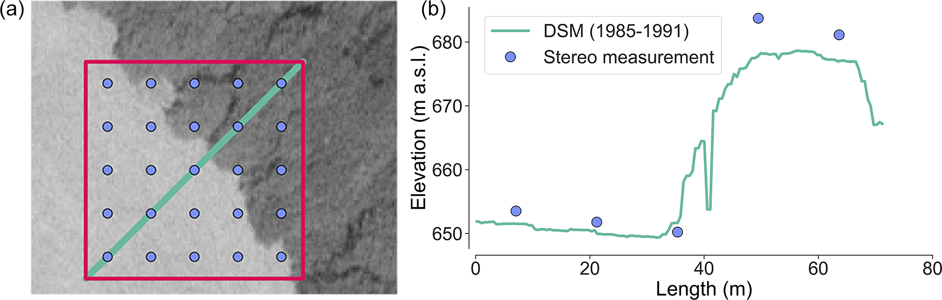 Figure 9Stereo measurements within a Swiss National Forest Inventory (NFI) forest plot on the historical orthophoto of epoch 1 (a). In (b), a comparison is depicted between the digital surface model (DSM) profile (green line, interval of 1 m) and the elevation values of the stereo measurements.