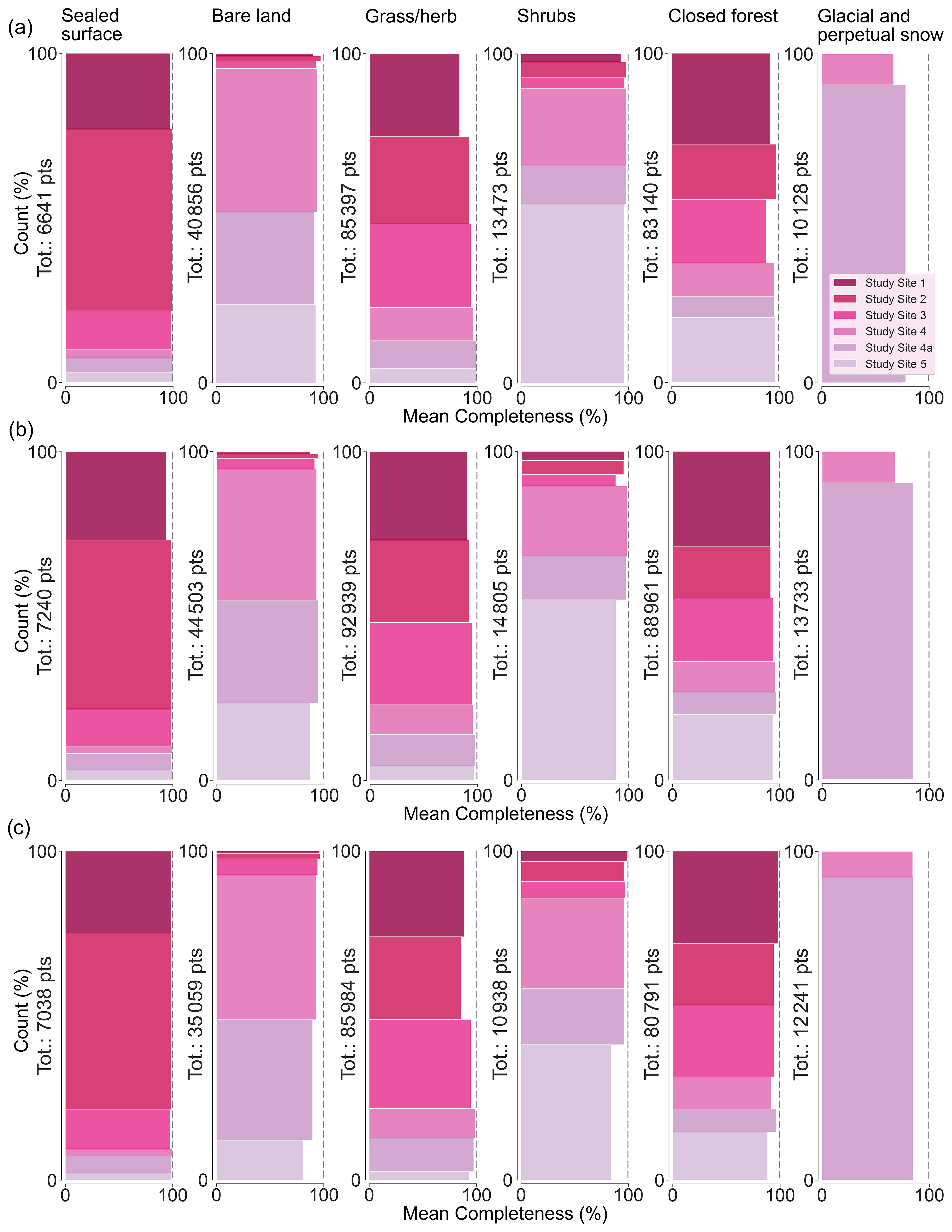 Figure A2Distribution of the mean completeness values, as percentages, for (a) epoch 2, (b) epoch 3, and (c) epoch 4, across the six study sites and the six land cover classes – sealed surface, bare land, grass/herb, shrub, closed forest, and glacial and perpetual snow. The last class is only present in study sites 4, 4a, and 5.