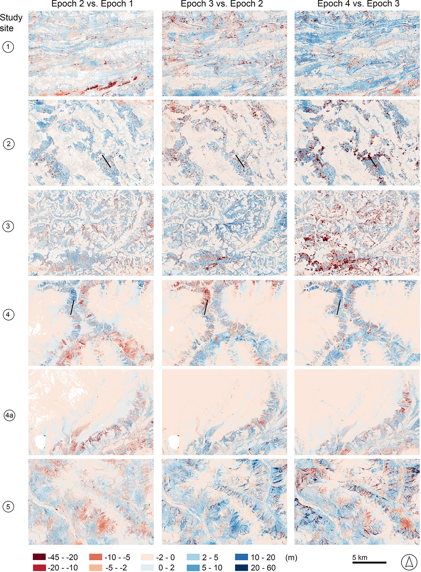 Figure A3The height difference between the vegetation height models (VHMs) of consecutive epochs for each study site (1–5). The black line in study sites 2 and 4 indicates the location of the profile shown in Fig. 10.