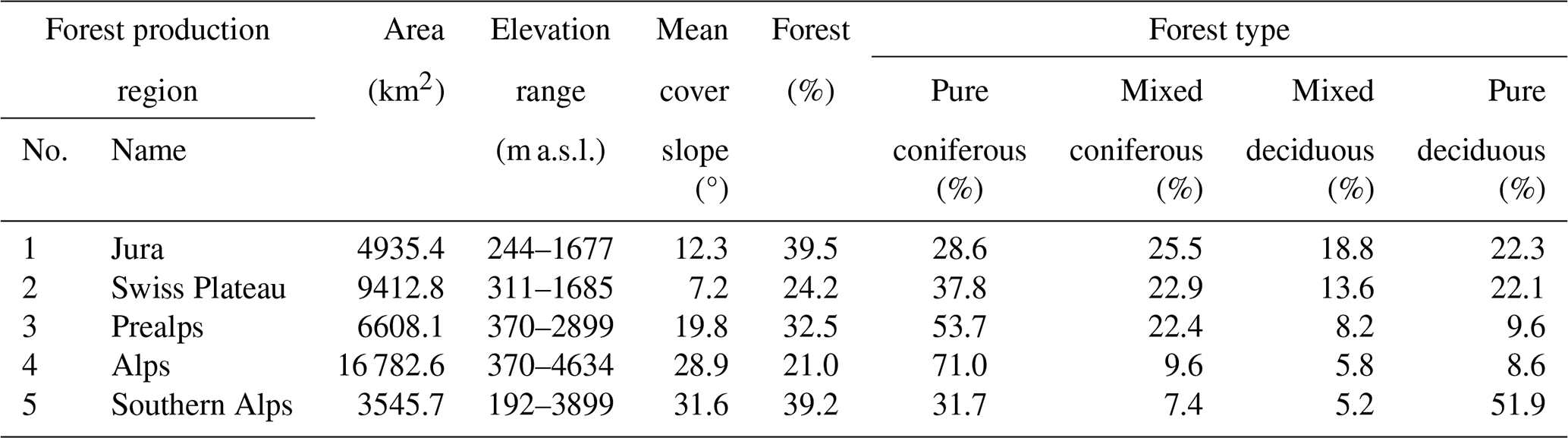 Table 1Forest production region characteristics. Topographic parameters are based on the swissALTI3D digital terrain model (DTM) version 2017. Forest parameters are based on the Swiss National Forest Inventory (NFI).