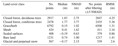 The quality of the generated DSMs was assessed by analysing (1) the completeness achieved through the image-matching process over different land cover types and (2) the elevation accuracy based on elevation differences to reference datasets (see Sect. 2.3.1). The elevation differences were calculated consistently as the historical DSMs minus the reference data. Therefore, positive differences indicate that historical DSMs had positive biases, i.e. that the reference data were lower than the historical DSM. Quality assessment was performed and reported for the six selected areas and the countrywide DSMs.