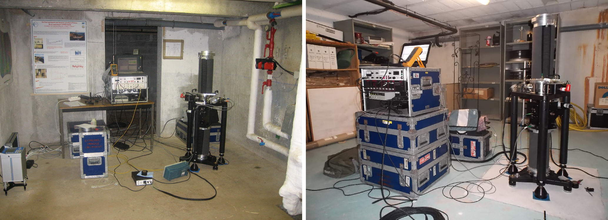 Figure 2FG5#228 absolute gravimeter observing at Shom in Brest (France) above Ref01 ground floor maker in August 2007 (left) and above Ref02 marker in July 2022 (right).