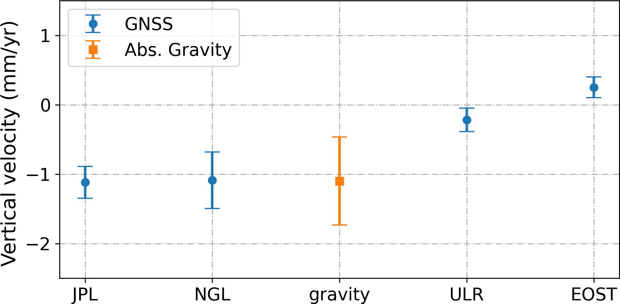 Figure 7Estimates of vertical land motion (VLM) at Brest using different data sets: gravity (this study) or GNSS (solutions from various groups, see text). Error-bars are 1σ (68 % C.I.).