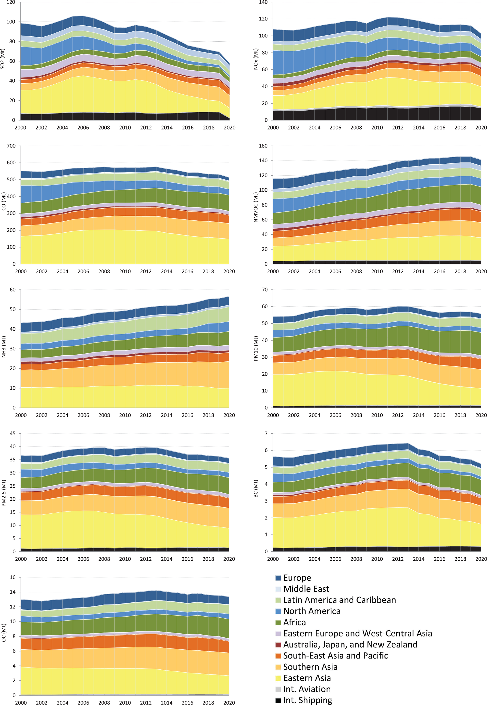 One of the key strengths of the HTAP_v3 emission mosaic was the temporal coverage of the emissions, spanning the 2000–2018 period, enabling the analysis of emission trends over the past two decades. The development of a global emission mosaic over such long time series represented a unique product for air quality modelling and for better-informed policy making, reflecting the effort of the TF-HTAP community to improve understanding of the transboundary transport of air pollution. The year 2000 was chosen as the start year since it often represents the year from which complete datasets of annual air pollutant emissions can be generated. It also represents a turning point for several emerging economies (e.g., China) and the strengthening of mitigation measures in historically developed regions (e.g., EU, USA, etc.).