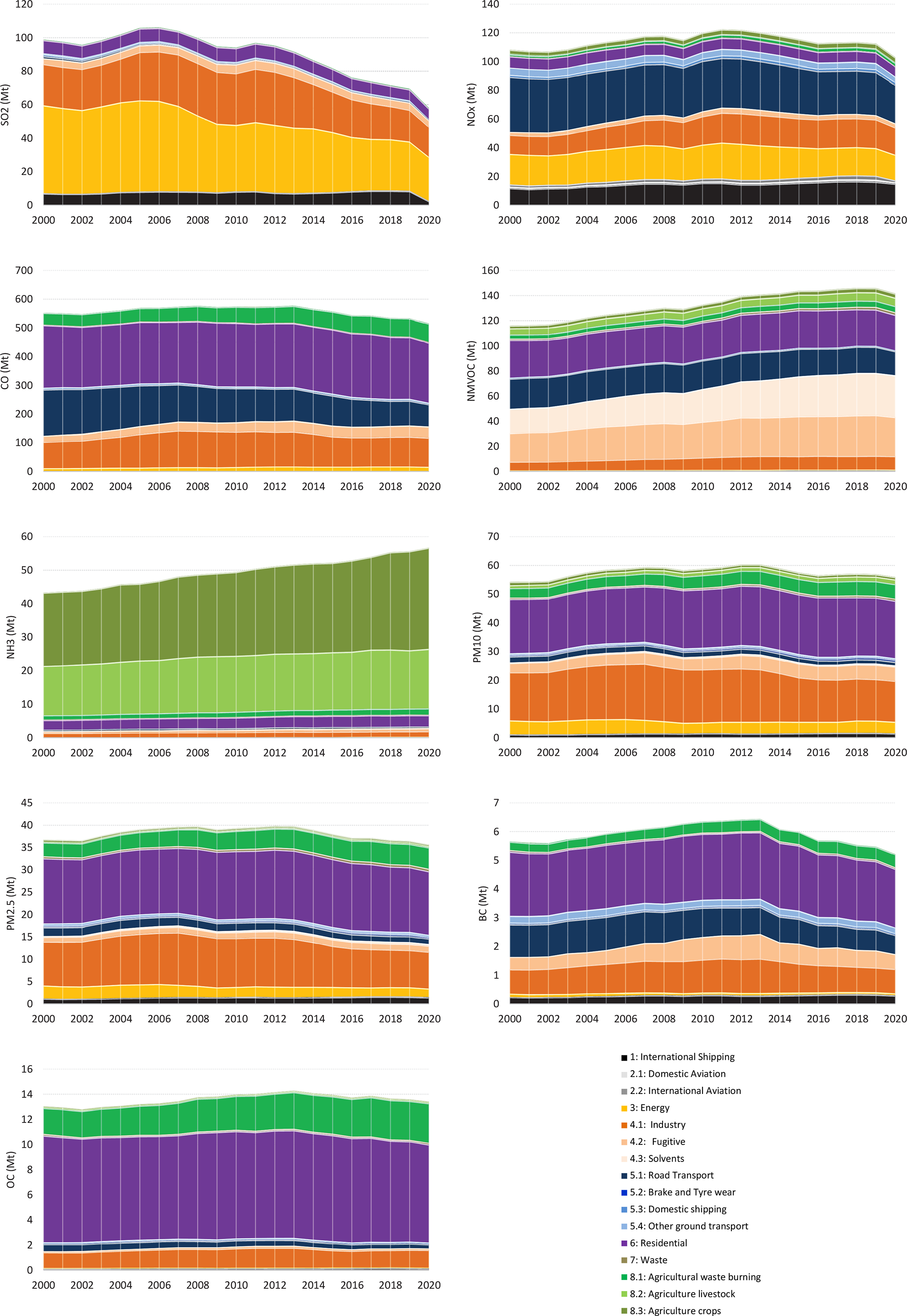 emission time series (from 2000 to 2020) of SO2, NOx (expressed as NO2 mass unit), CO, NMVOC, NH3, PM10, PM2.5, BC, OC by emitting sector and country, and