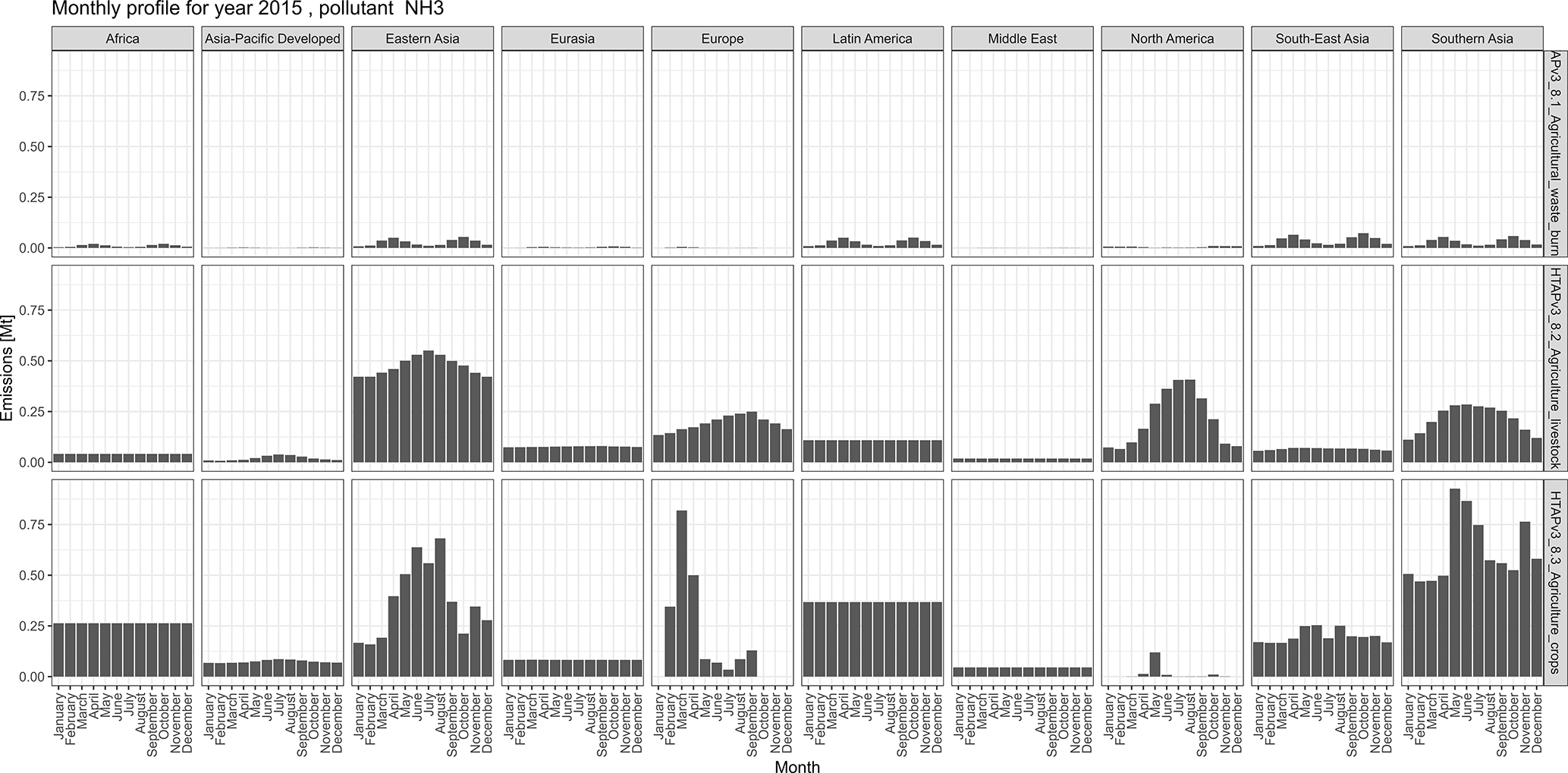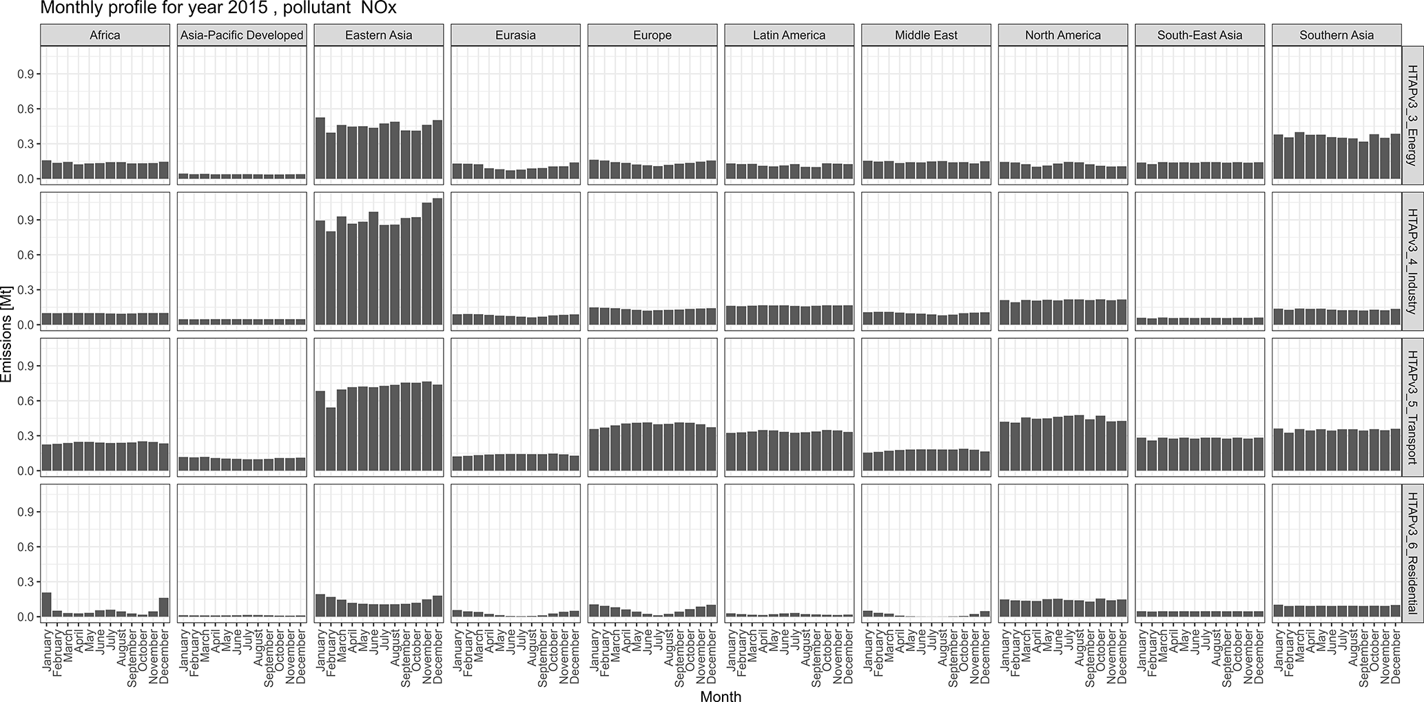 Compared to the two previous HTAP emission mosaics, HTAP_v3.2 input emission gridmaps were provided with monthly time distributions to better reflect the regional seasonality of sector specific emissions (e.g., household, power generation, and agricultural activities). Information on emission peaks over certain months of the year is also a useful information for the development of territorial policies to mitigate localised emission sources in space and time (e.g., emissions from residential heating over winter months, agricultural residue burning, etc.).