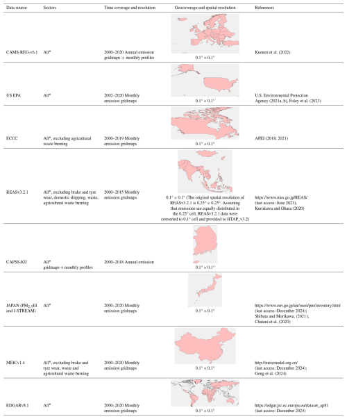 The HTAP_v3 mosaic was composed by integrating official, spatially distributed emissions data from the Copernicus Atmosphere Monitoring Service Regional inventory CAMS-REG-v5.1 (Kuenen et al., 2022), US EPA (U.S. Environmental Protection Agency, 2021b, a; Foley et al., 2023), Environment and Climate Change Canada (ECCC) (NPRI, 2017), the Regional Emission inventory in ASia (REAS), CAPSS-KU, and JAPAN (https://www.env.go.jp/air/osen/pm/inventory.html, last access: 27 October 2025) (Kurokawa and Ohara, 2020; Chatani et al., 2018, 2020) inventories. As the information gathered from the official reporting covers only part of the globe, HTAP_v3 was completed using emissions from the Emissions Database for Global Atmospheric Research (EDGAR) version 6.1 (https://edgar.jrc.ec.europa.eu/dataset_ap61, last access: 27 October 2025).