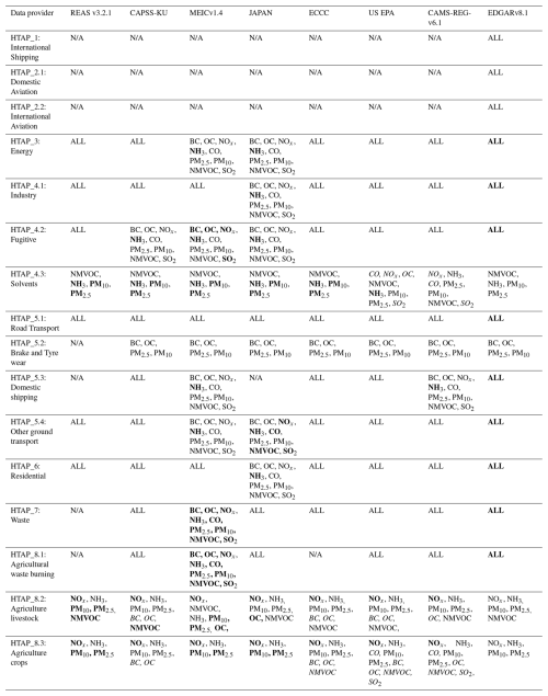 Table 3Overview of pollutant and sector provided by each inventory in HTAP_v3.2. “ALL” indicates that all substances are provided. “N/A” indicates that the emissions for those sectors were not provided and/or used in HTAP_v3.2 for a specific inventory and were gap-filled with the corresponding information from EDGARv8.1. The other cells represent the data availability for each sector and inventory. The pollutants' font style refers to the data source: plain text represents pollutant emissions provided by a specific inventory, bold indicates emissions gap-filled using EDGARv8.1, and italic indicates combinations of sectors–pollutants available for specific regional inventories but not in EDGAR, which typically represents minor sources of emissions included in officially reported inventories. These minor sources are included in the HTAP_v3.2 mosaic.