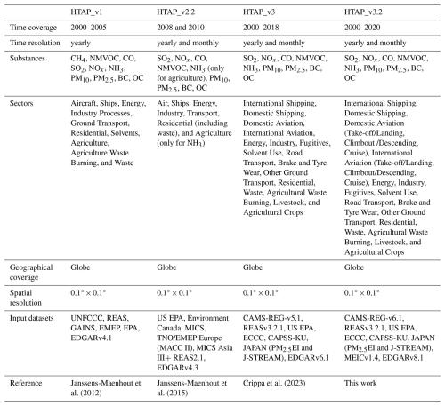 The two previous generations of HTAP emission mosaics had limited temporal coverage. HTAPv1 covered the period 2000–2005 with annual resolution (https://edgar.jrc.ec.europa.eu/dataset_htap_v1, last access: 27 October 2025, Janssens-Maenhout et al., 2012), while HTAPv2.2 covered two recent years (2008 and 2010), but with monthly resolution (Janssens-Maenhout et al., 2015) (https://edgar.jrc.ec.europa.eu/dataset_htap_v2, last access: 27 October 2025). However, the needs of the TF-HTAP modelling community are continuously evolving to both foster forward-looking air quality science and produce more fit-for-purpose analyses in support of efficient policy making. HTAP_v3 therefore not only covers the time period of the previous HTAP phases, but also extends it forward by almost a decade, to provide the most up-to-date picture of global air pollutant emission trends. Another distinguishing feature of the HTAPv3 mosaic is a considerably higher sectoral resolution than previous iterations of the HTAP mosaic inventories (Sect. 2.2), enabling more policy-relevant use of the inventory.